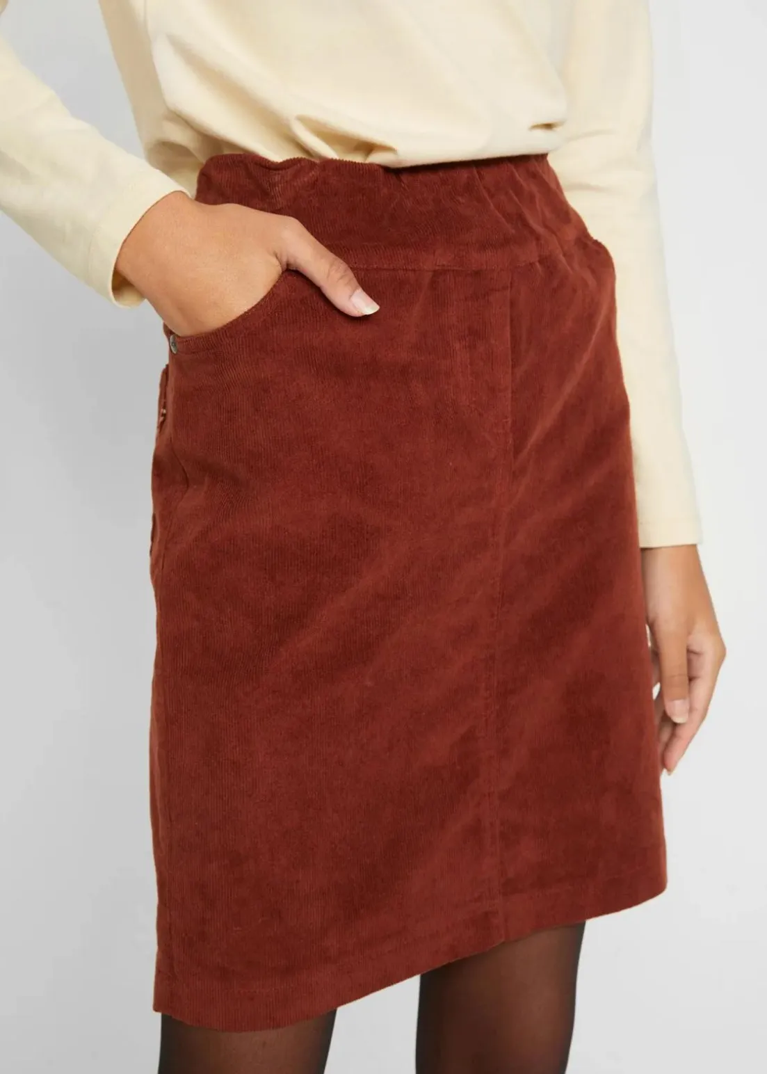 Stretch-Cordrock mit elastischem Bund in knieumspielender Länge. ONLINEBESTELLHINWEIS: Rock kann hinten Stickerei enthalten.