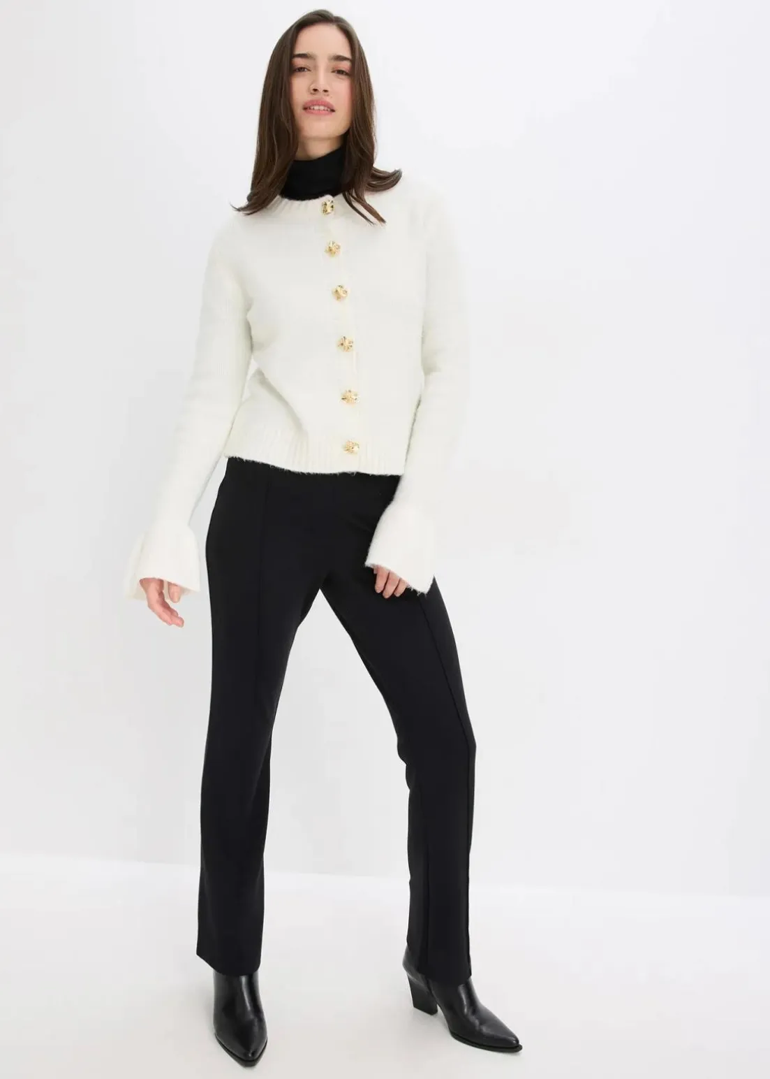 feminine Strickhacke mit dekorativen Knöpfen und Volants am Ärmelsaum