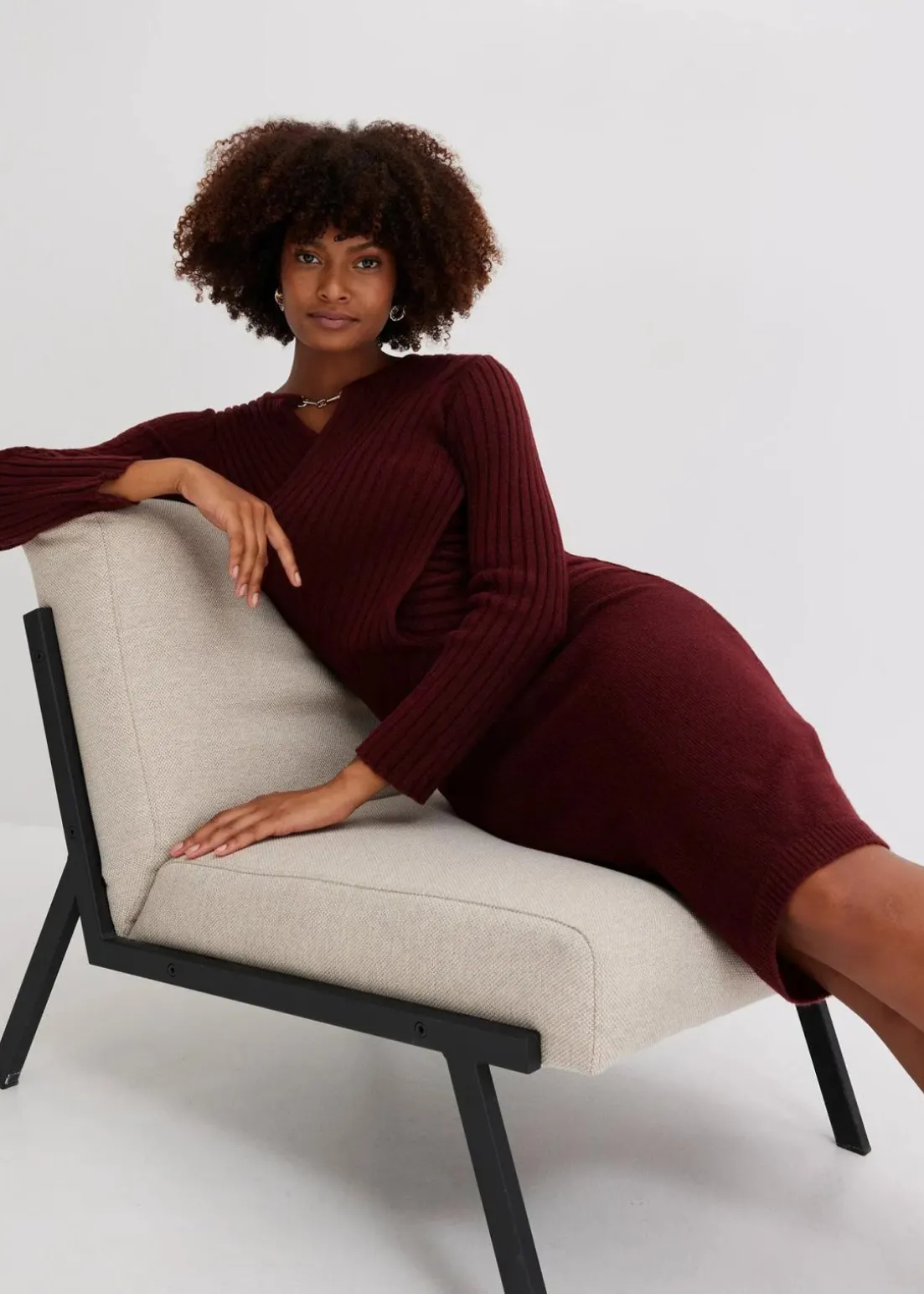 Modern und feminin: Strickkleid mit Rippmuster und Oberteil im Wickeloptik