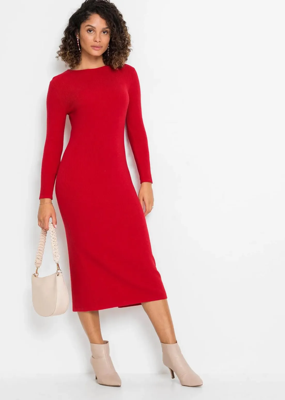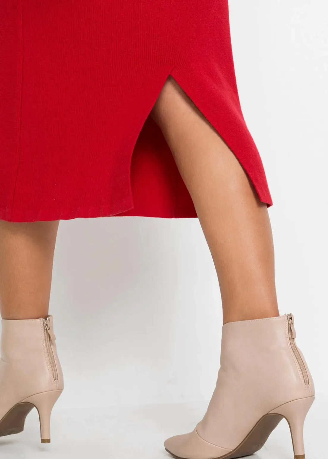 Stylisches Strickkleid mit dekorativem Schlitz am Saum der Rückseite und femininer Silhouette.