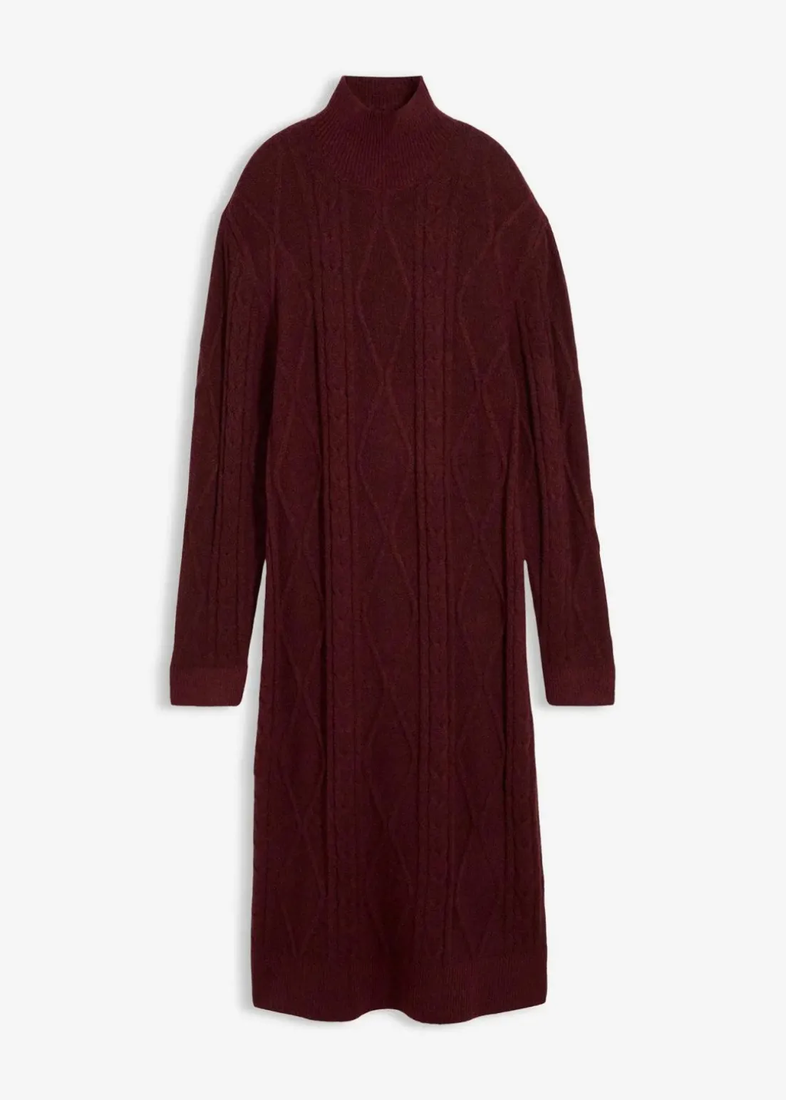 Langes Strickkleid in weiter Passform mit Zopfmuster. Mit hoch geschnittenem Kragen und überschnittener Schulter.