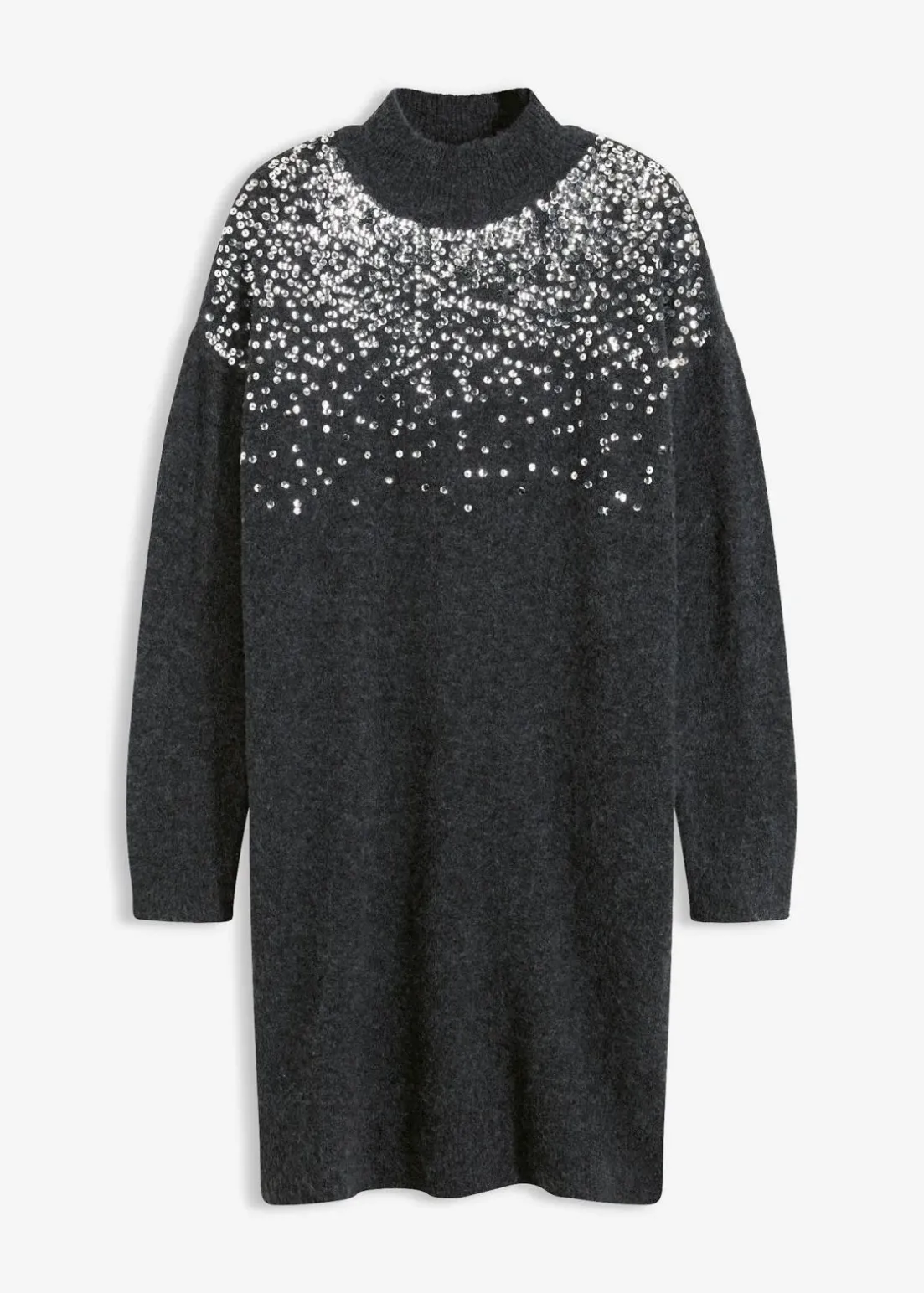 kurzes Strickkleid mit dekorativer Pailletten-Applikation vorne