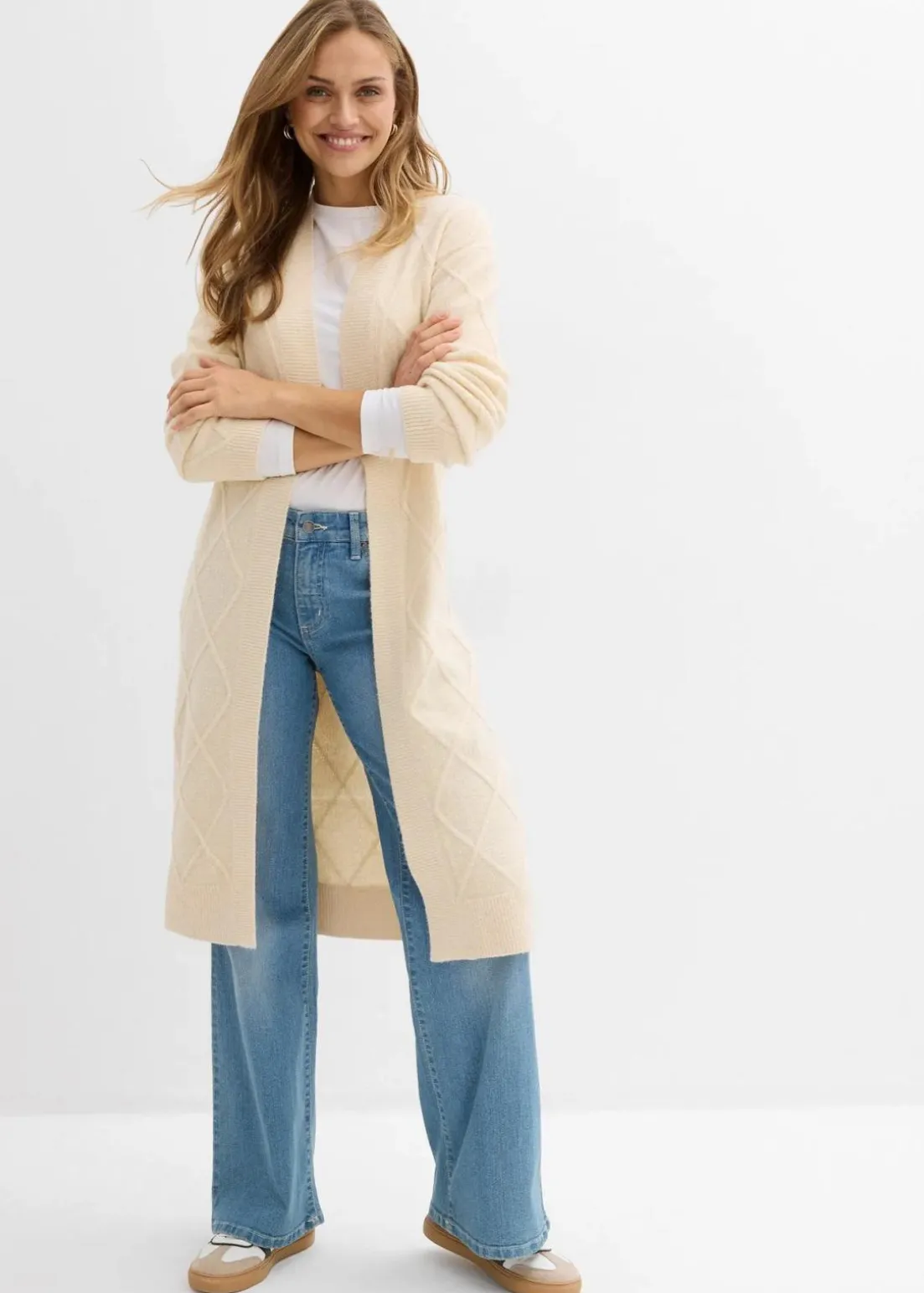 Langer Strickmantel aus Zopfstrick. Modell mit überschnittenen Schultern und Bindegürtel.