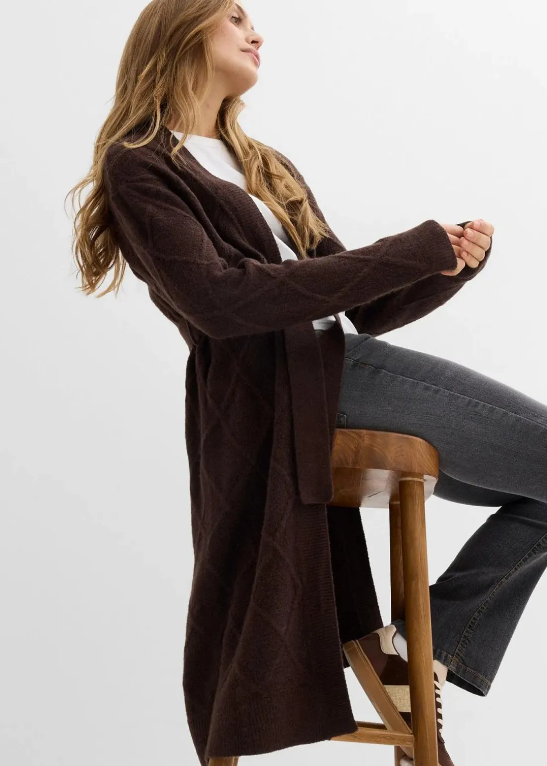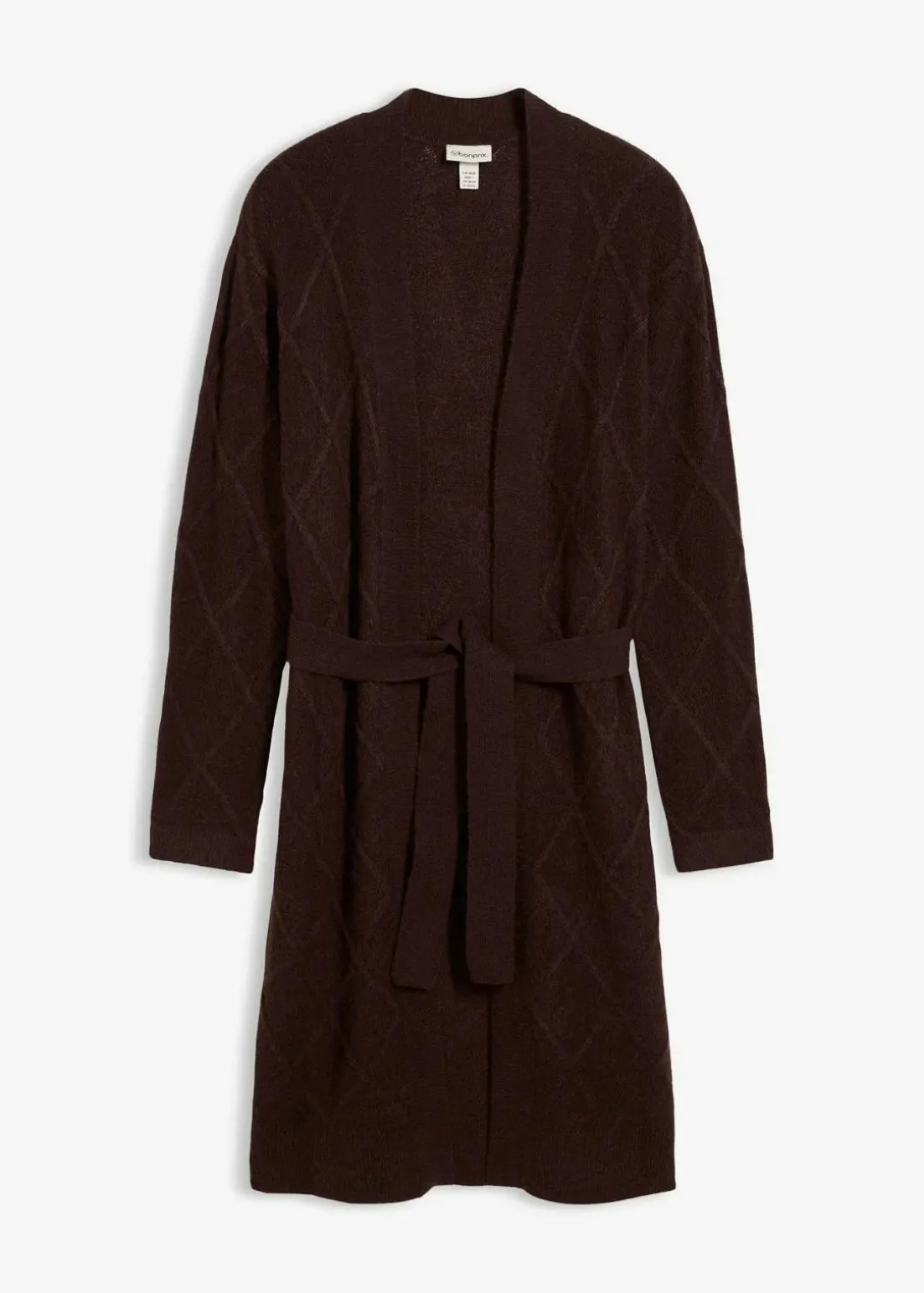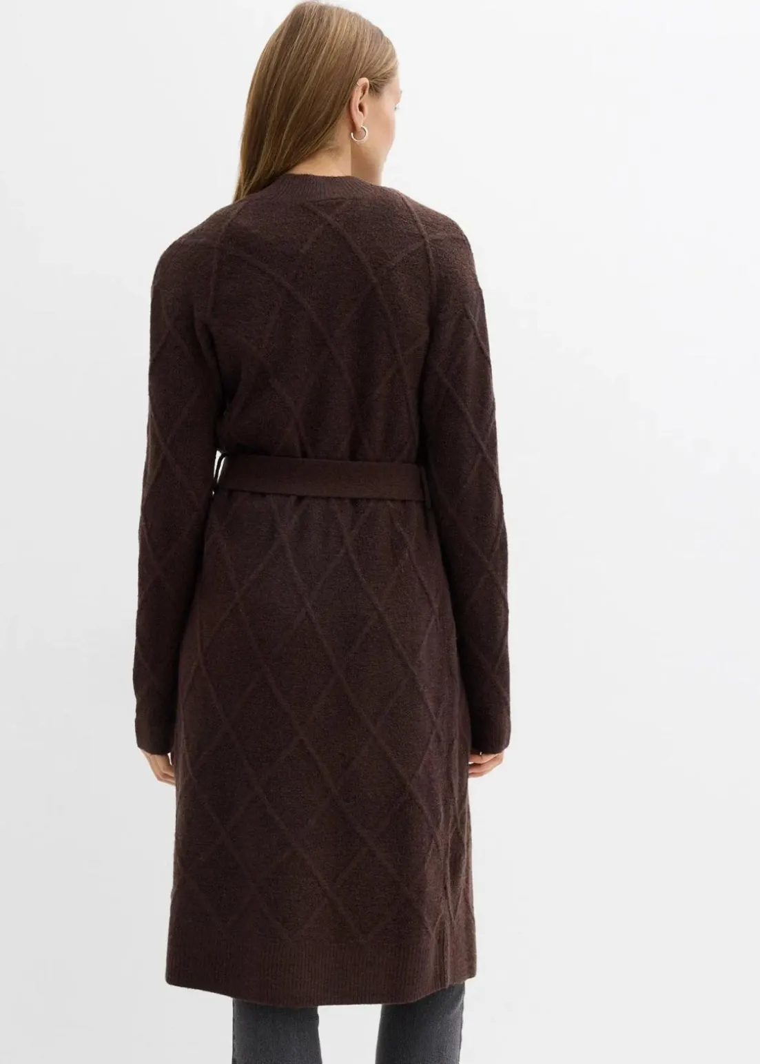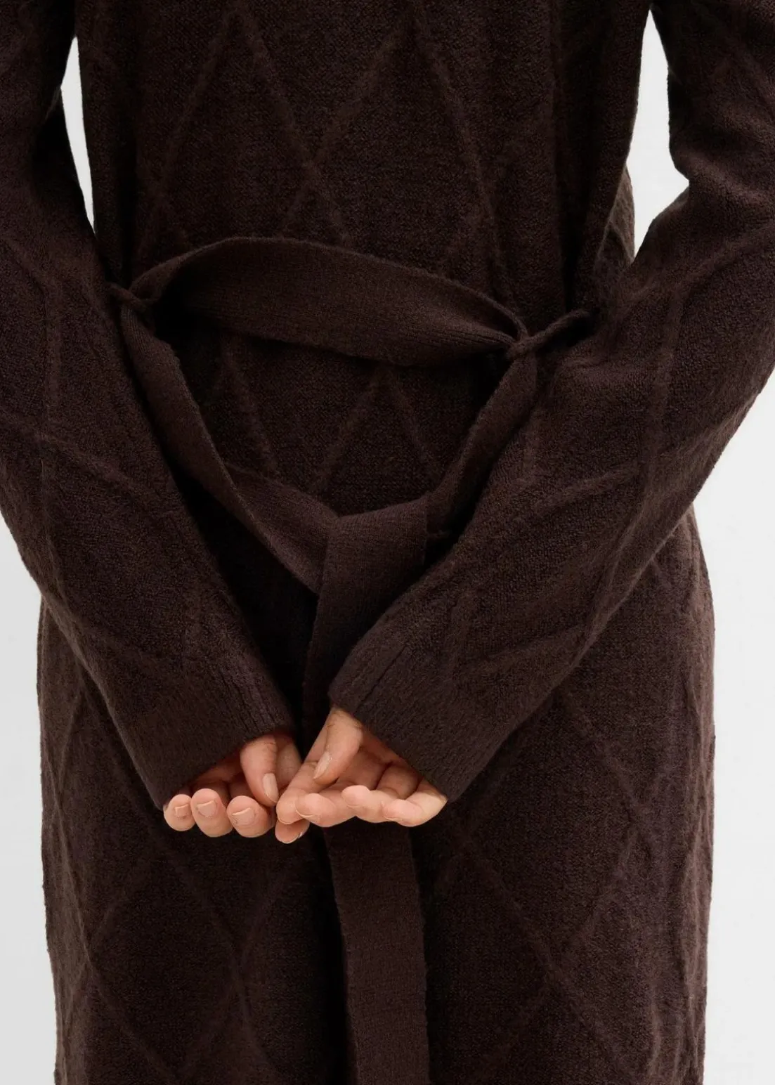 Langer Strickmantel aus Zopfstrick. Modell mit überschnittenen Schultern und Bindegürtel.