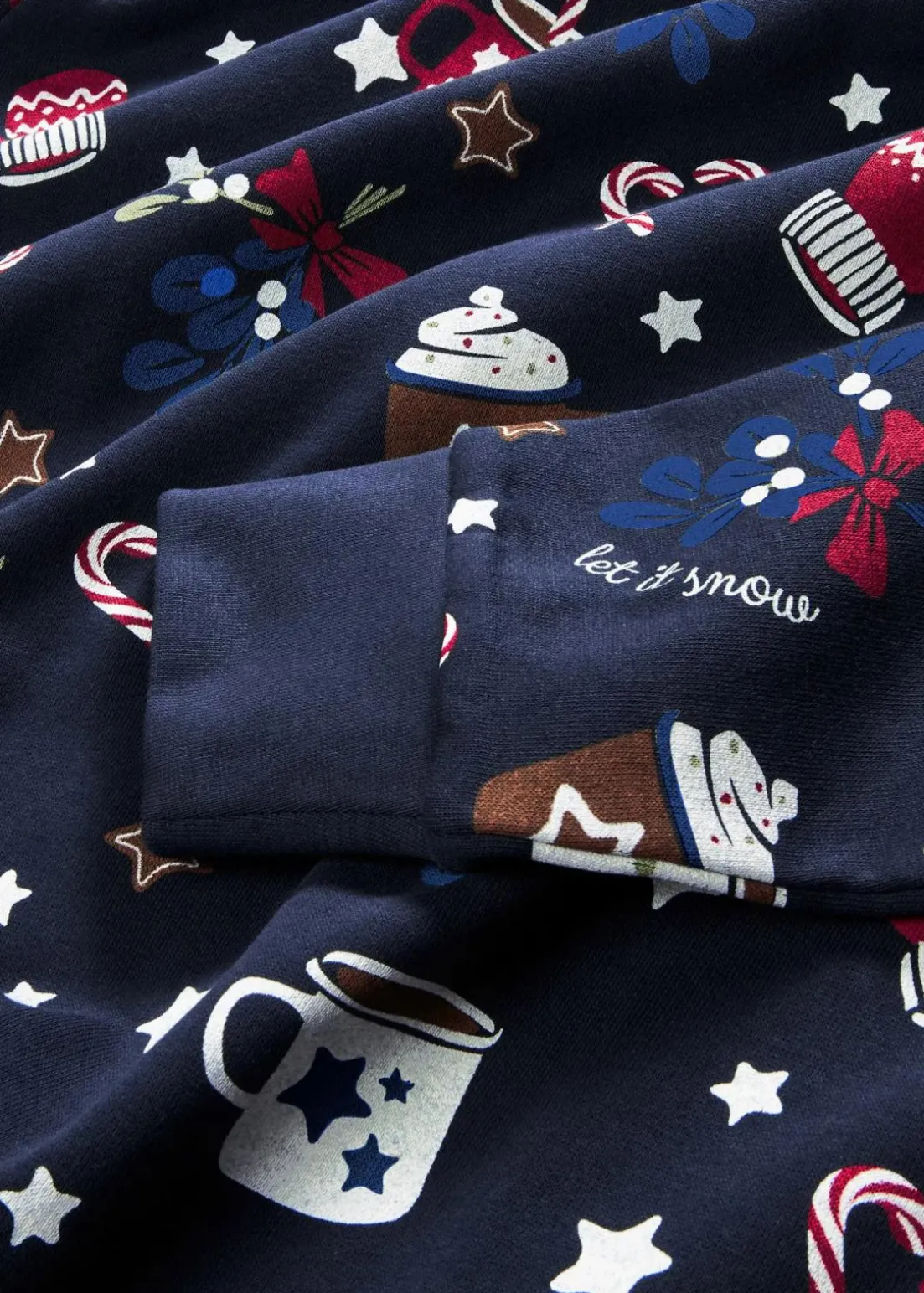 Weihnachtlich bedrucktes Sweatkleid mit Kaputze und Seitenschlitzen
