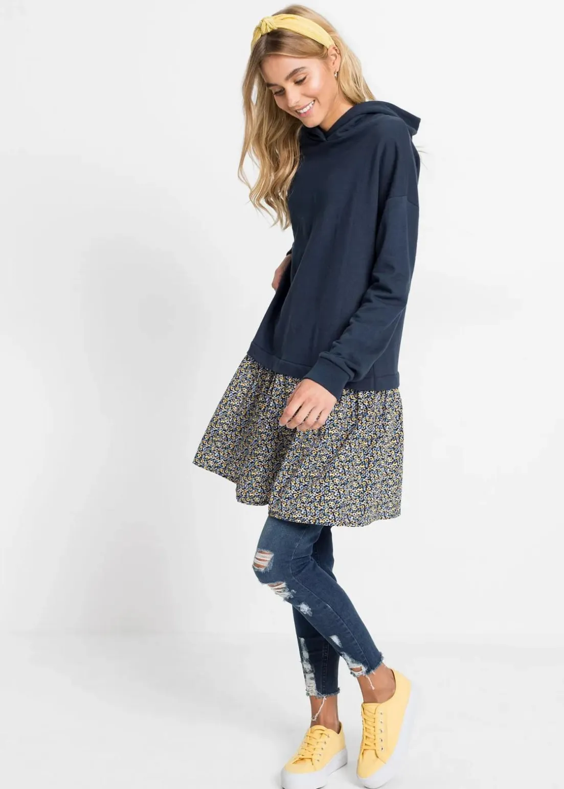 Lässiges Sweatkleid in 2-1 Optik mit Kapuze
