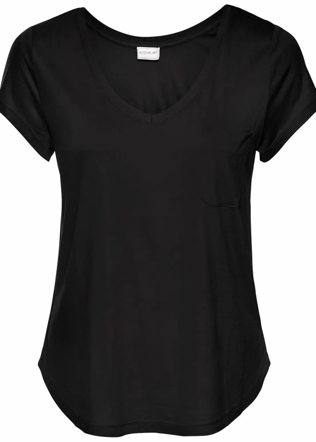 Schönes Shirt mit einem leicht glänzenden Stoff, einem dezenten V-Ausschnitt, einem abgerundeten Saum und einer kleinen Brusttasche. Länge in Gr. 36/38 ca. 64 cm.