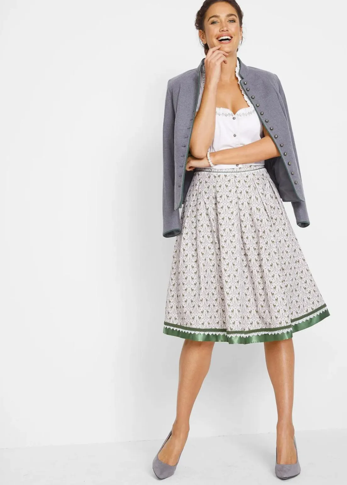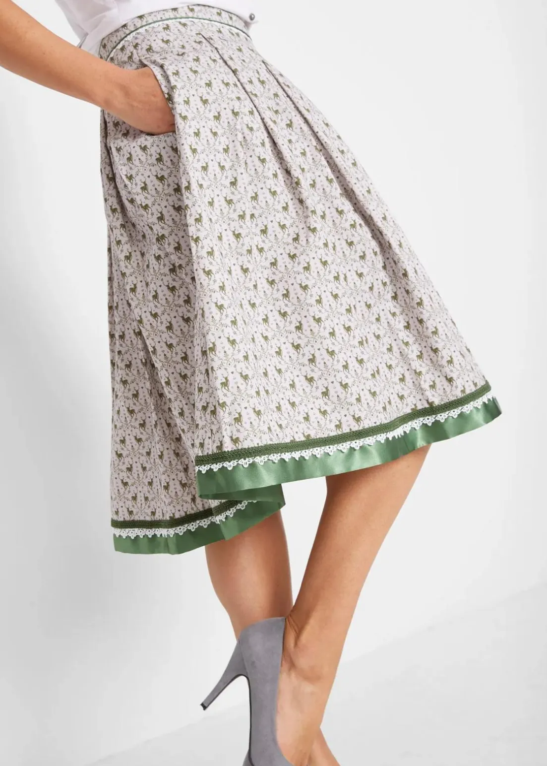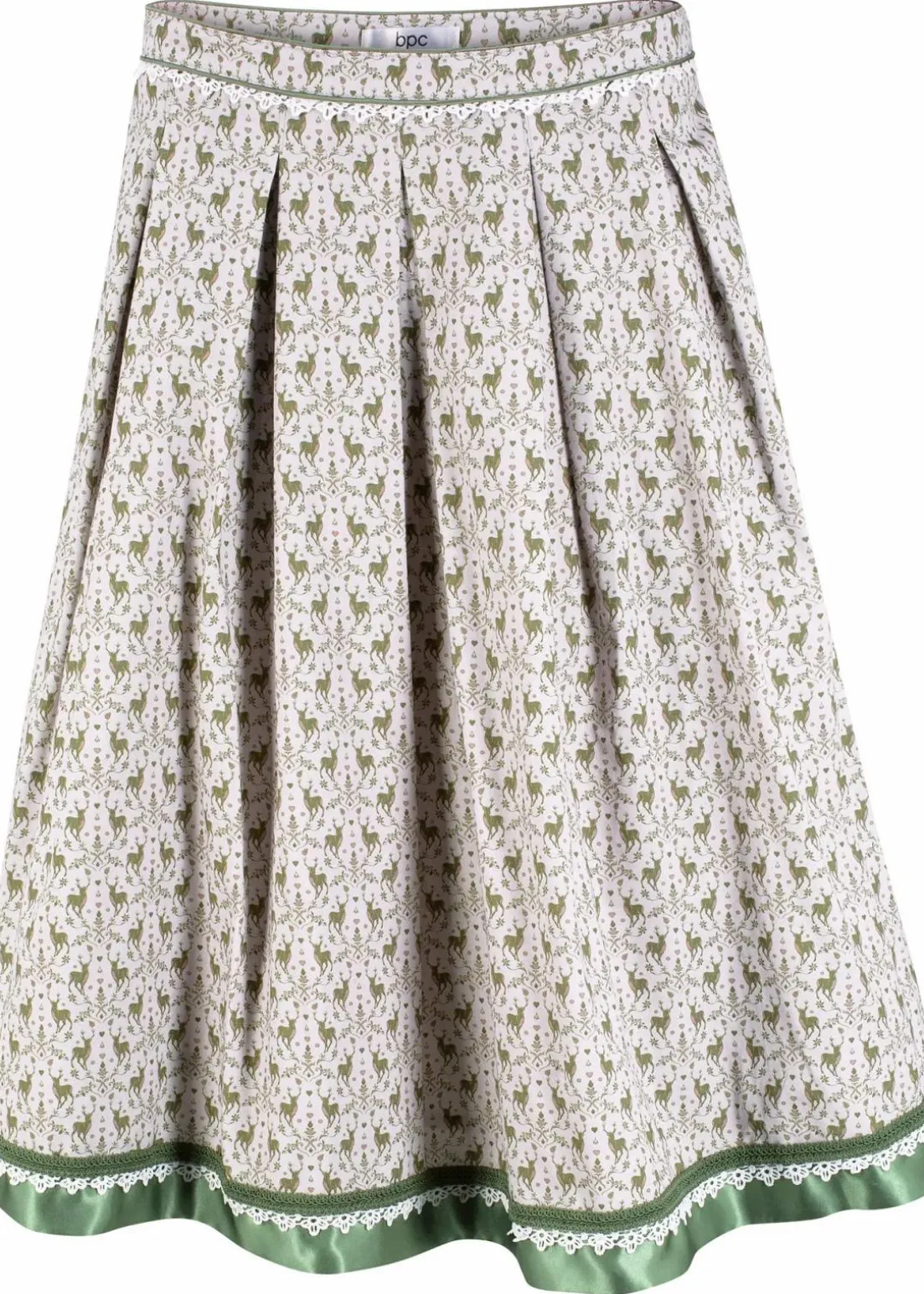 Dieser stilvolle Trachtenrock überzeugt mit seiner Teller-Silhouette. Das komfortable Modell erhält mit dem ausgestellten Saum einen attraktiven Schwung und sieht zugleich sehr edel aus. Zu einem dezenten Hirschmuster gesellt sich am Saum eine dekorative Satinbordüre. Vom breiten Bund gehen ansprechende Falten aus. Ein schön taillierter Blazer und dezente Pumps bringen diesen stylishen Trachtenrock aus Baumwollqualität von bpc fantastisch zur Geltung.Länge von ca. 58 cm (Gr.38) – 62 cm (Gr.56), maschinenwaschbar.