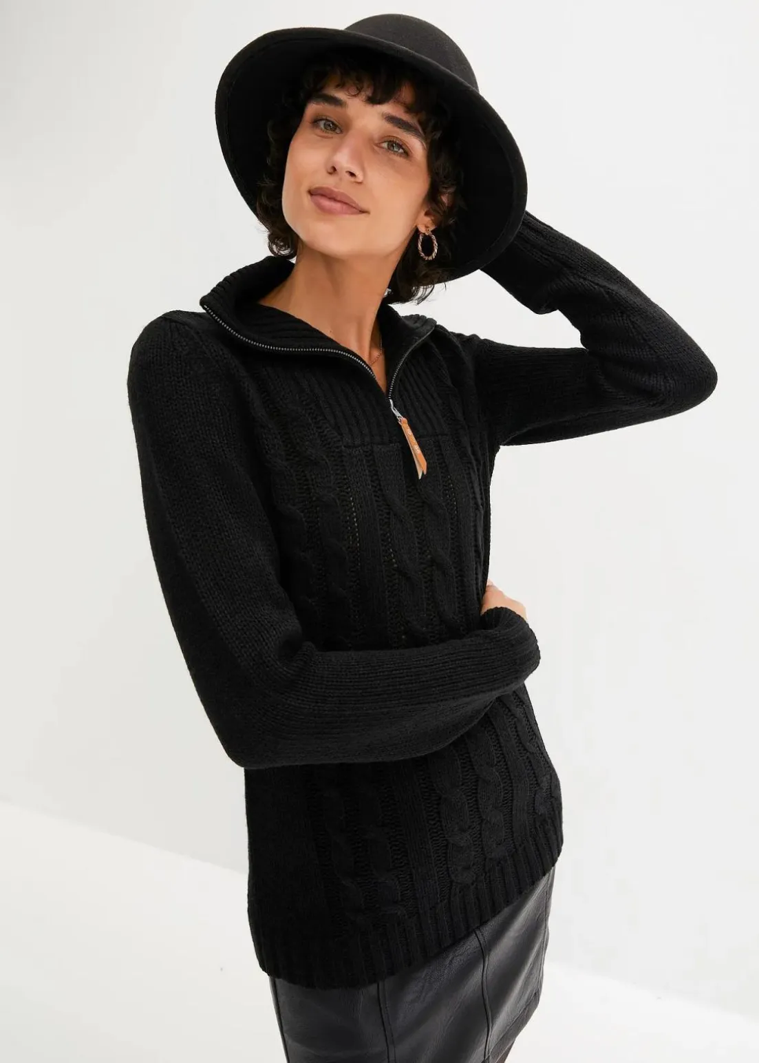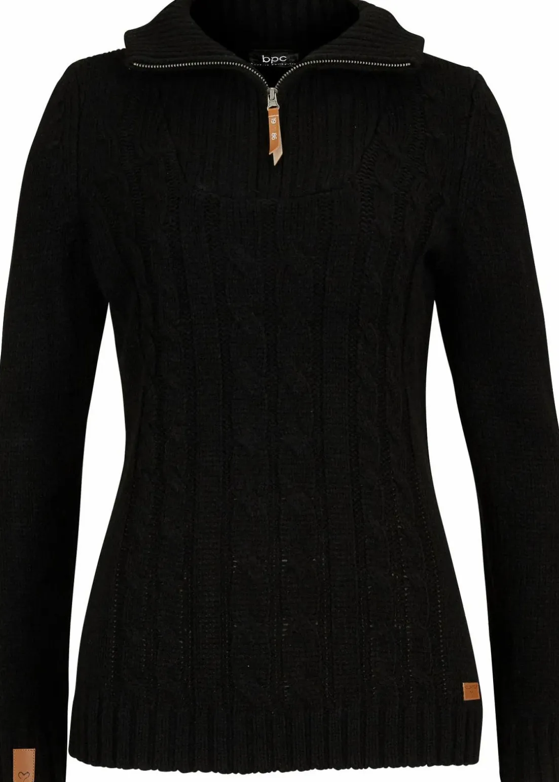 Gestrickter Troyer-Pullover mit schönem Zopfmuster und Leder-Details