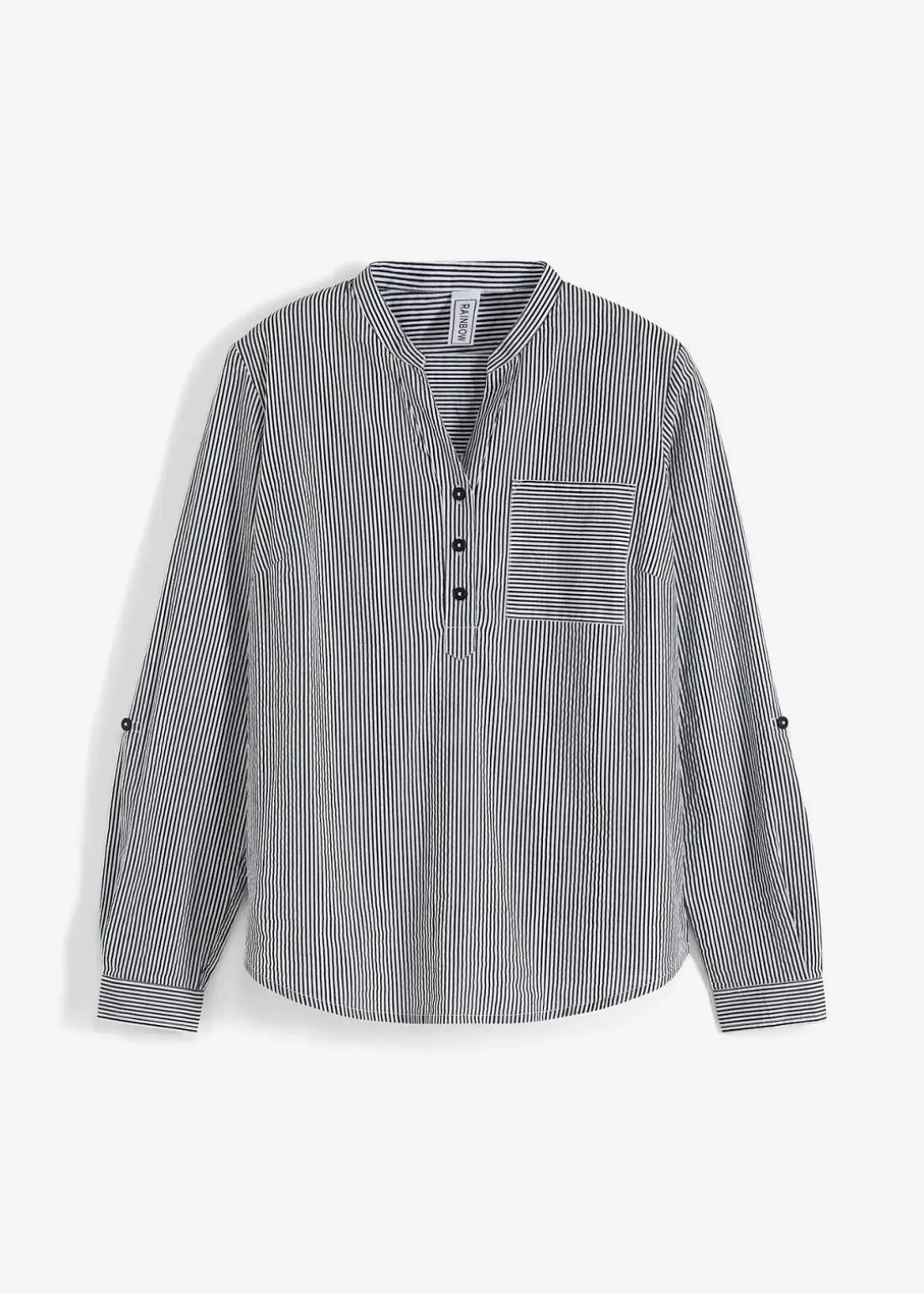 Mit dieser langärmligen Tunika kreieren Fashionistas legere Looks für die Freizeit. Ein kleiner Stehkragen und eine aufgesetzte Brusttasche sorgen für eine moderne Note. Die Turn-up-Funktion ermöglicht das Fixieren der gekrempelten Ärmel mit Riegel und Knopf.Die Tunika begeistert mit einer kurzen Knopfleiste am Ausschnitt und einem figurumspielenden Schnitt mit abgerundetem Saum.