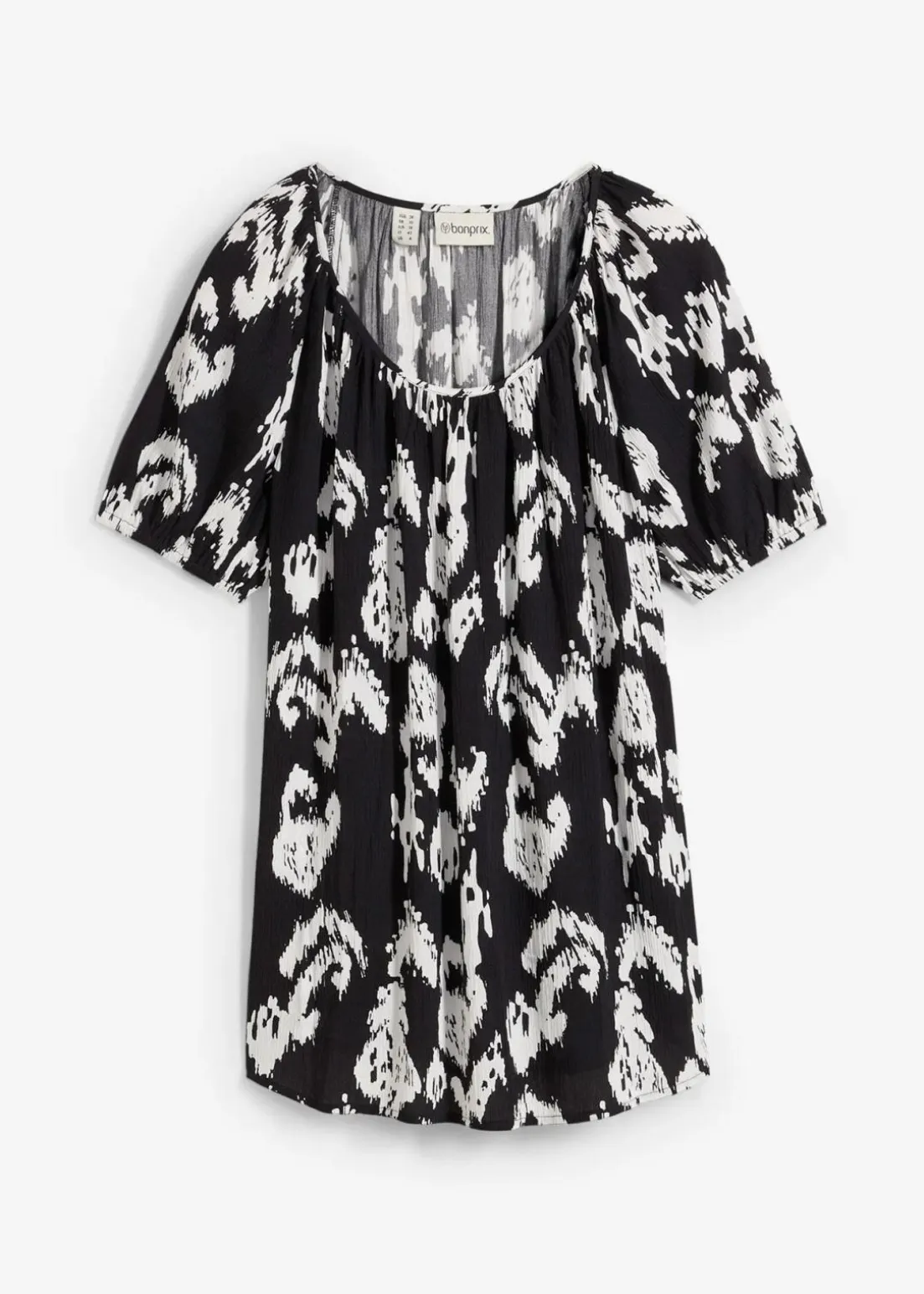 Tunikabluse aus leicht strukturierter Viskose. Mit elastischem Abschluss am Ärmelbündchen und leichtem A-Shape.