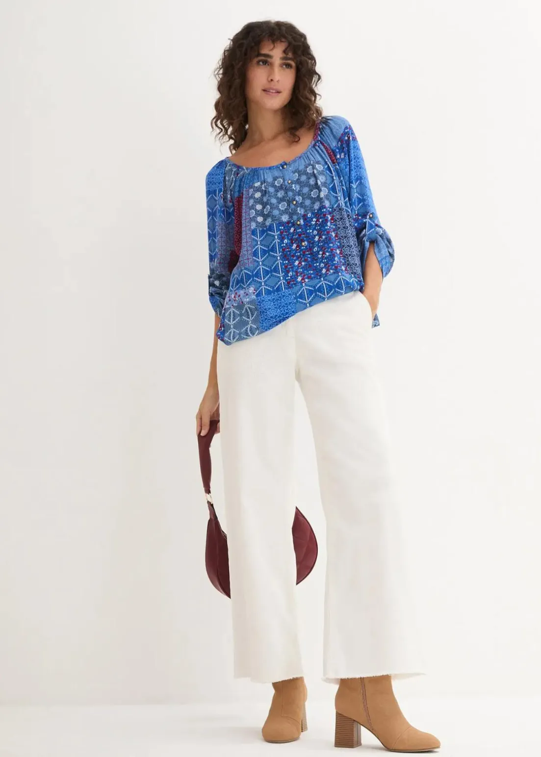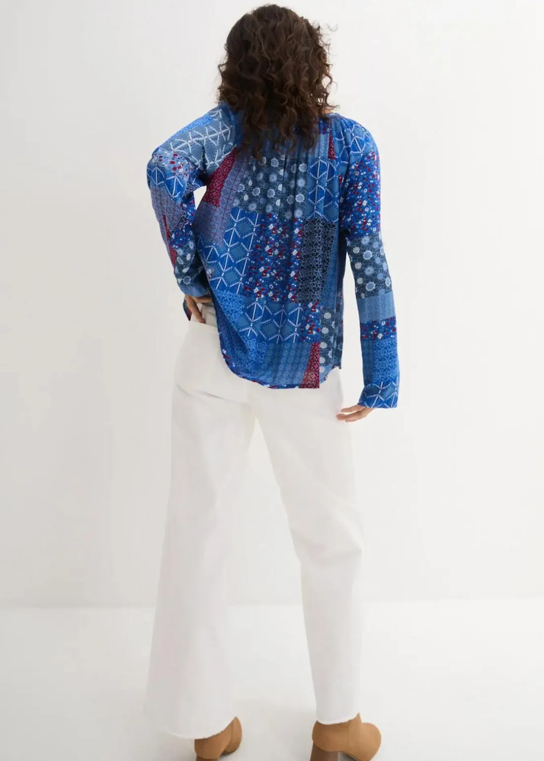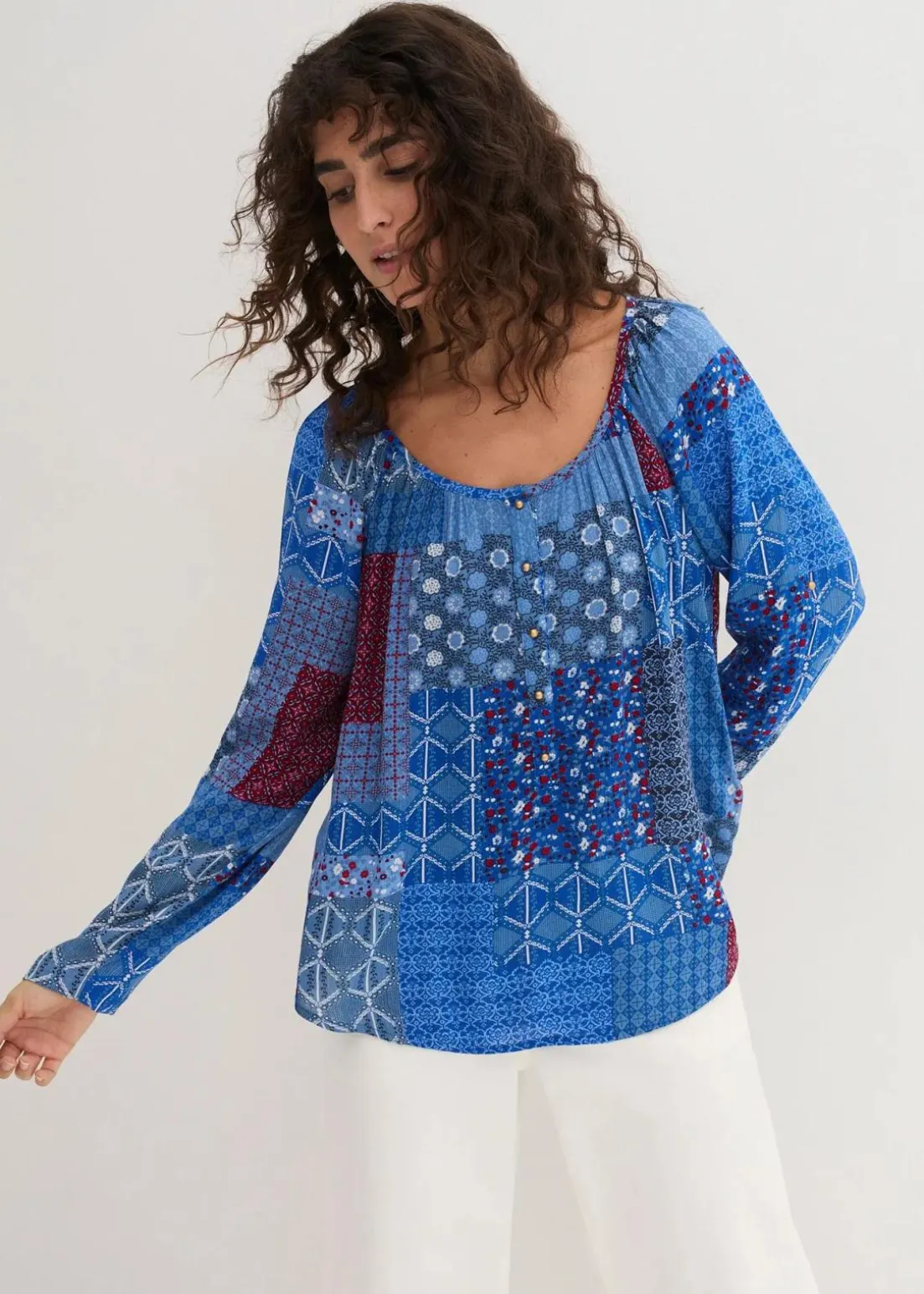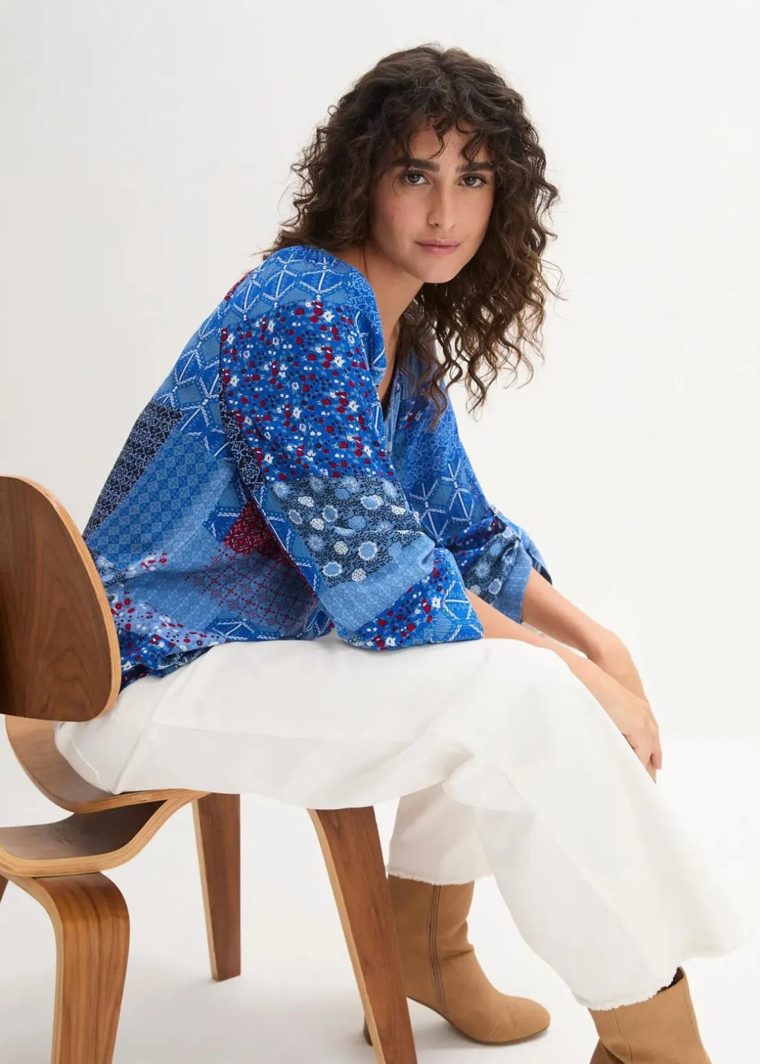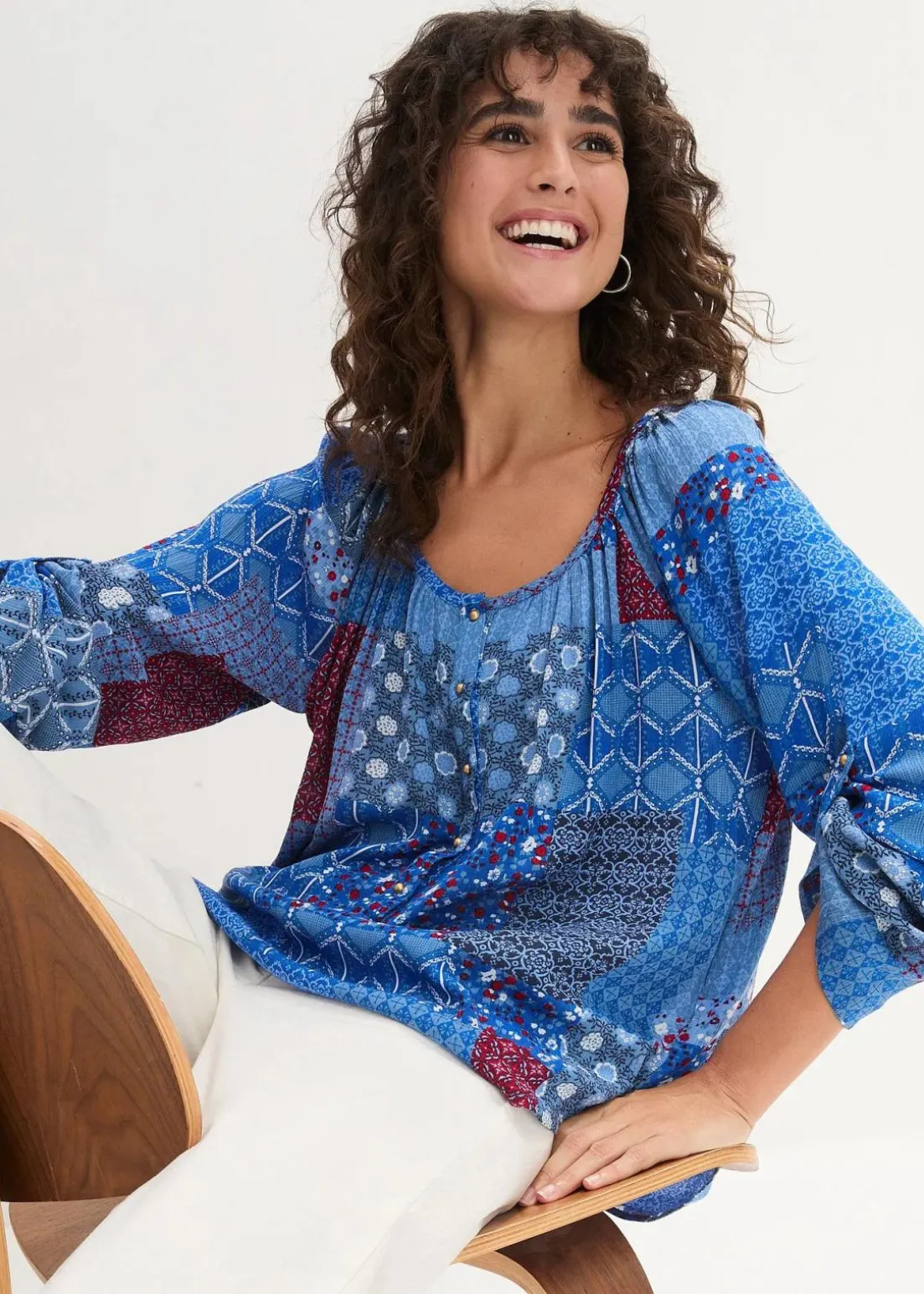 Leicht fallende Langarm-Tunikabluse mit Crincle-Effekt. Durch das besondere Druckverfahren ist jedes Teil ein Unikat