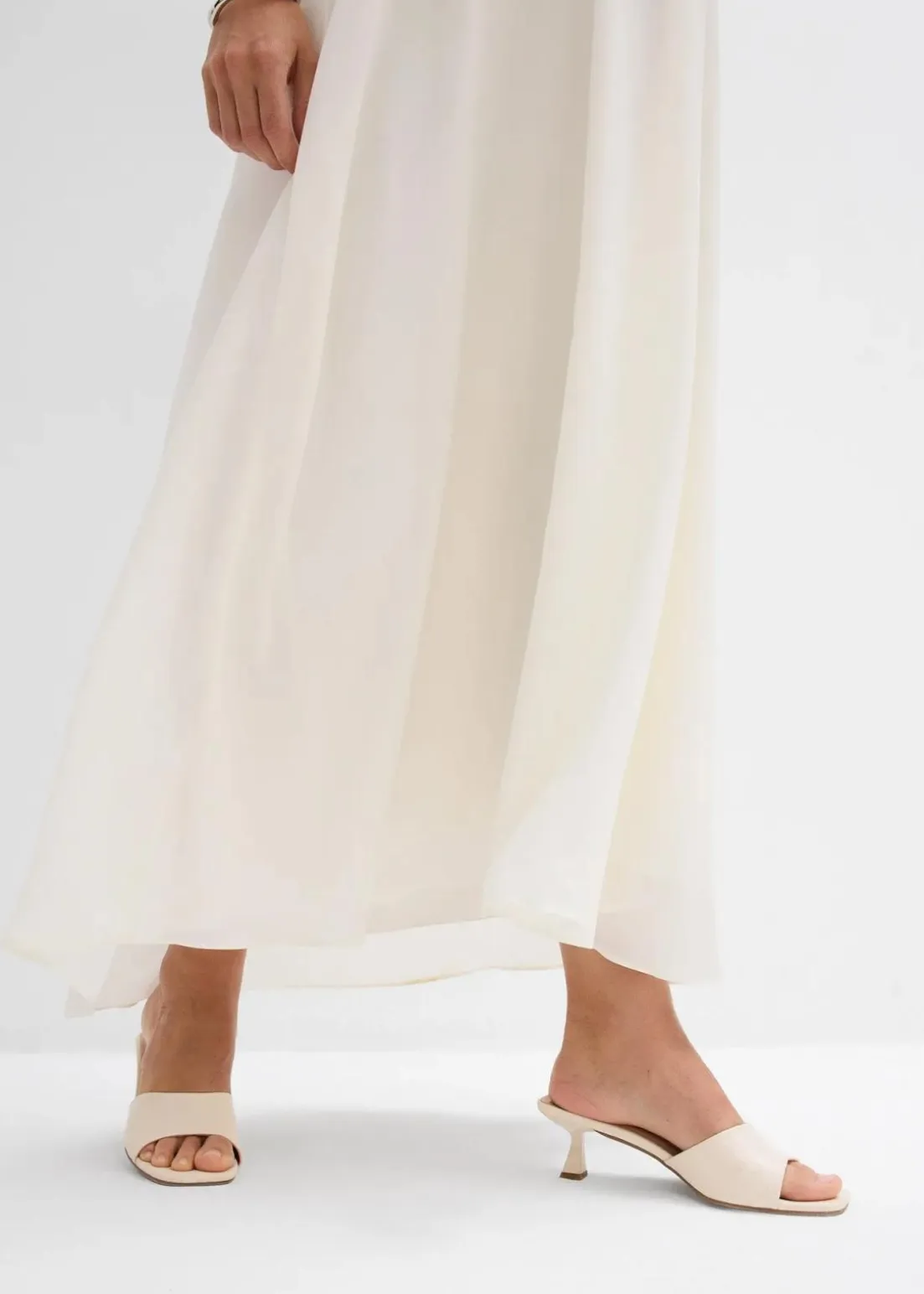 Hübsches Brautkleid mit V-Ausschnitt und schmalen Trägern. Für ein angenehmes Tragegefühl wurden diese mit einem elastischen Einsatz am Rücken versehen. Das Oberteil ist doppellagig aus Satin und Spitze gefertigt und verfügt über eingenähte Cups sowie einen elastischen Smokeinsatz am Rücken. Zusätzlich sorgt ein zarter Unterbrust-Einsatz für eine schmeichelhafte Silhouette. Der Rock besteht aus zartem Georgette-Stoff, der fließend fällt und am Rücken in zarten Falten eingenäht ist. Darunter befindet sich ein Unterrock aus weichem Satin.