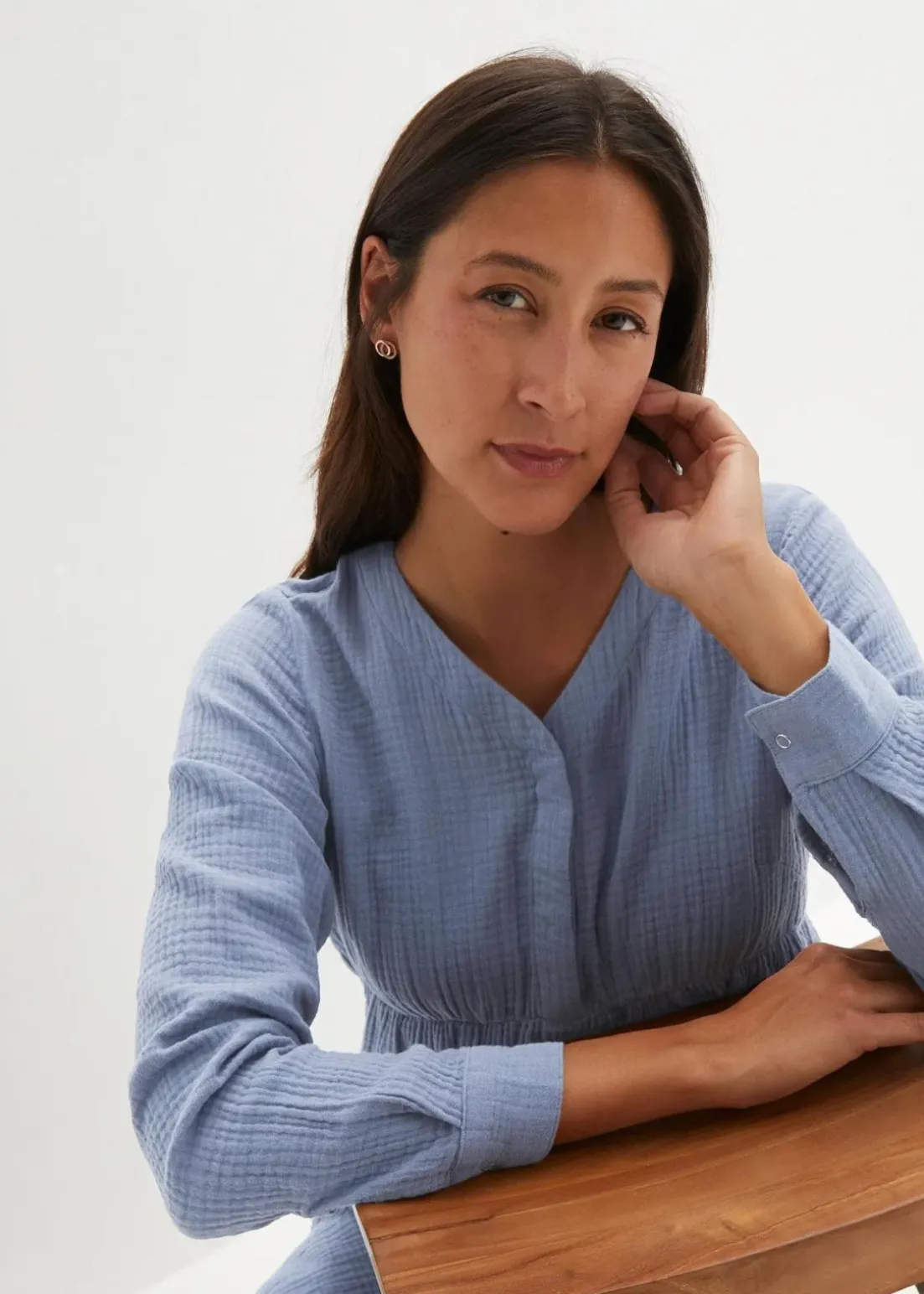 Langärmeliges Kleid mit V-Ausschnitt und einer kurzen, verdeckten Knopfleiste, die ein einfaches Stillen ermöglicht. Mit einem weichen elastischen Gummizug oberhalb der Taille und einem leicht ausgestellten Rock. Die Ärmel sind mit Manschetten und Knöpfen versehen.