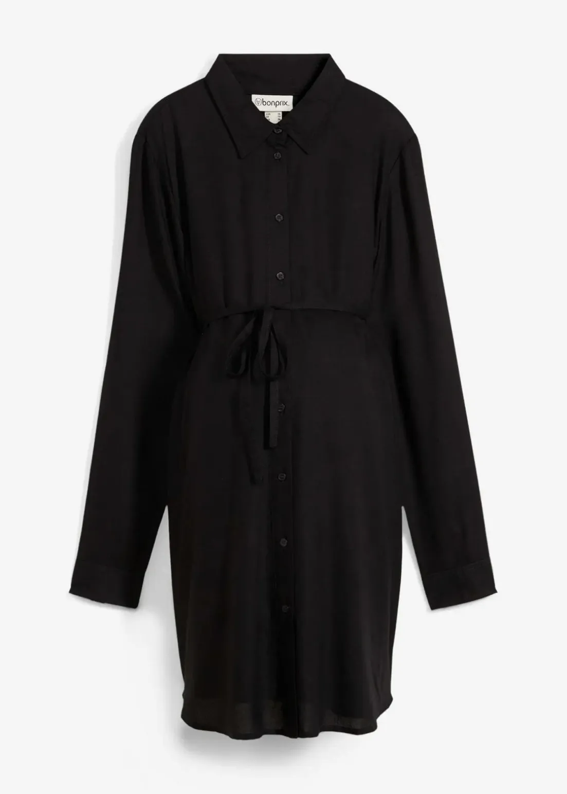 Hüftbedeckende Langarmbluse aus Viskose, mit durchgehender Knopfleiste und einem schmalen, abnehmbaren Bindeband unter der Brust. Leicht abgerundeter Saum.