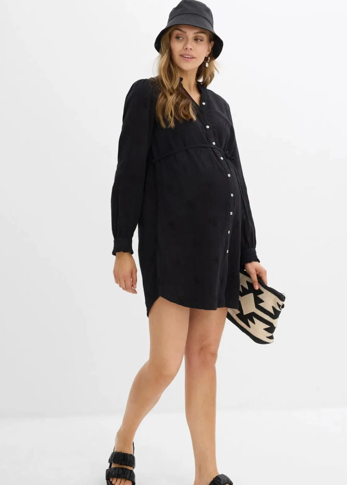 Weiche Umstandsbluse aus luftigem Musselin mit zarten Stickereien. Der Rundhalsausschnitt ist mit kleinen Rüschen verziert, und die langen Ärmel verfügen über Manschetten mit Knöpfen sowie zarte Raffungen an den Schultern. Die durchgehende Knopfleiste ermöglicht ein einfaches Stillen und ein bequemes An- und Ausziehen. Das abnehmbare Bindeband betont den wachsenden Babybauch und ermöglicht eine individuelle Weitenregulierung.