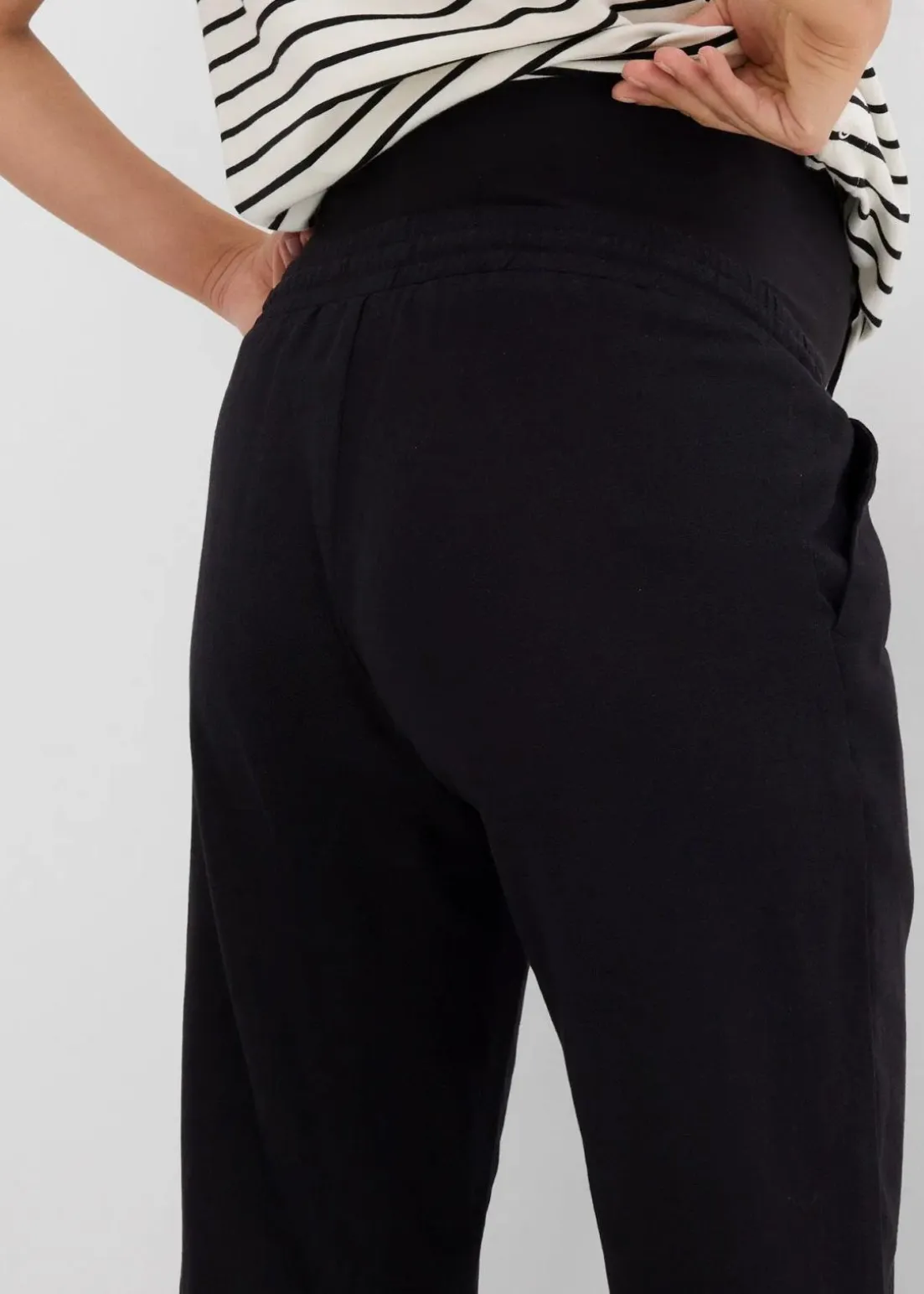 Zeitlose Umstandshose mit hochwertigem Leinen mit geradem, langen Bein mit einer bequemen Passform. Der breite, angesetzte Jerseybund aus Baumwolle mit etwas Stretch sorgt für eine optimale Passform am Bauch. Der Hosenbund ist mit einem elastischen Gummizug versehen und lässt sich durch das Bindeband in der Weite regulieren. Der Saum ist umgeschlagen und sie verfügt über zwei praktische Eingriffstaschen.