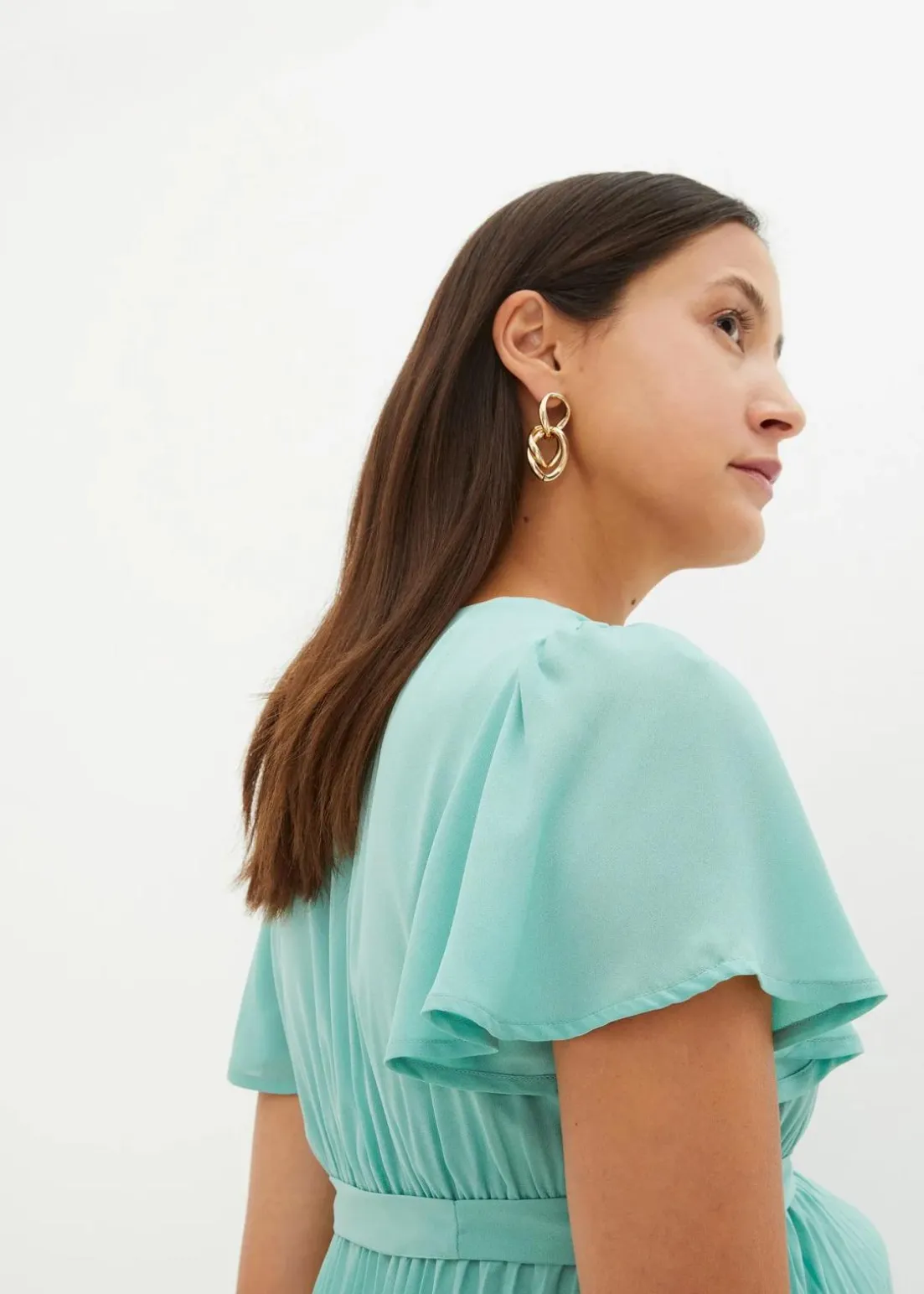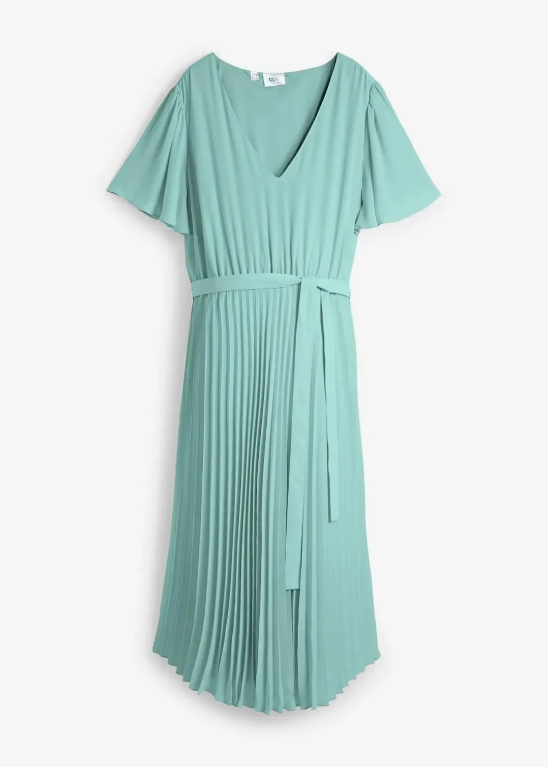 Wadenlanges Kleid aus leichtem Georgette mit V-Ausschnitt und Flügelärmel. Ein fließendes, farblich passendes Futter sorgt für die Blickdichte. Ein eingenähtes Gummiband an der Unterbrust, sorgt für eine schmeichelhafte Silhouette. Mit einem plissierten Rock und einem abnehmbaren Bindeband, das der Regulierung der Weite dient.