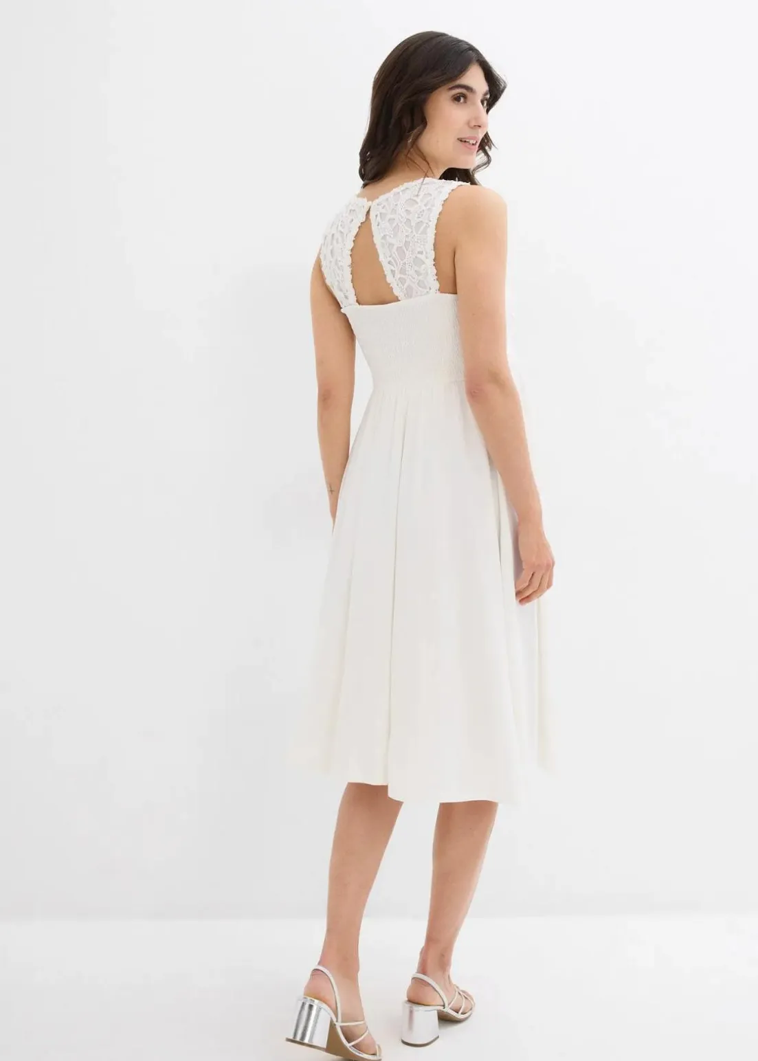 Umstandskleid aus Viskose mit etwas Stretch für ein angenehmes Tragegefühl, verziert mit elastischer Spitze am Oberteil und breiten Spitzenträgern am Rücken, die mit einem Knopf geschlossen werden. Der untere Rücken ist mit elastischem Smock ausgestattet, der für eine flexible Passform sorgt. Der Rock ist in einer leichten A-Linie geschnitten und schafft eine schmeichelhafte Silhouette.
