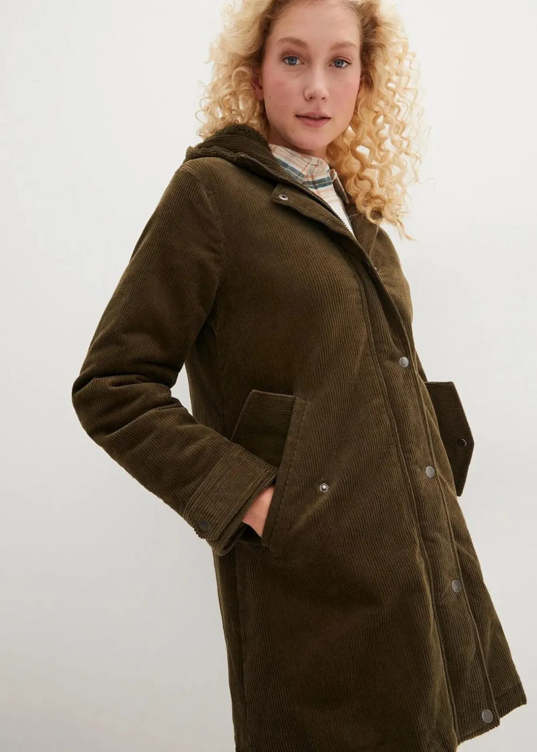 Modischer Parka aus Cord mit kuscheligem Teddy-Futter in der Kapuze in kaschierender Länge.