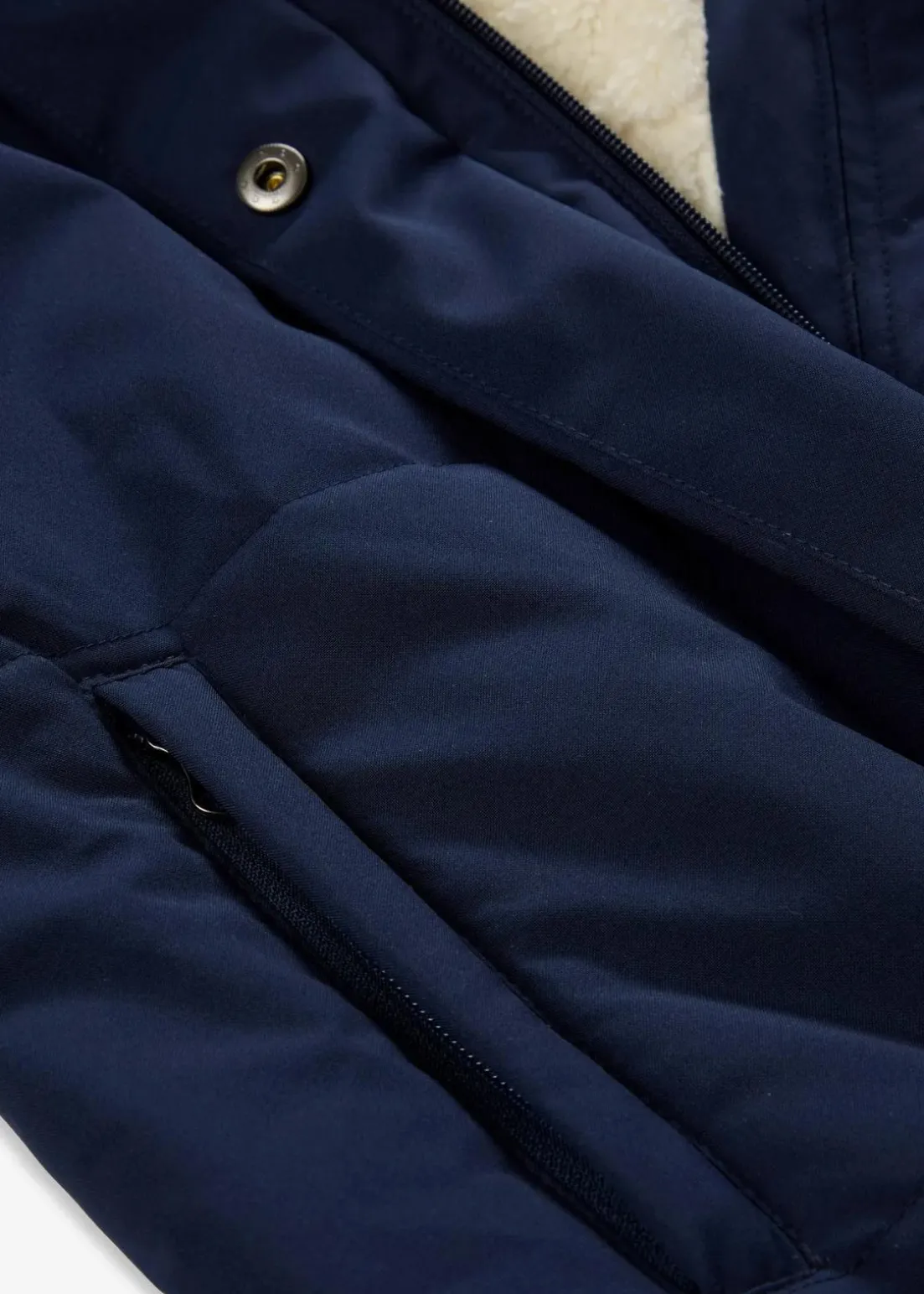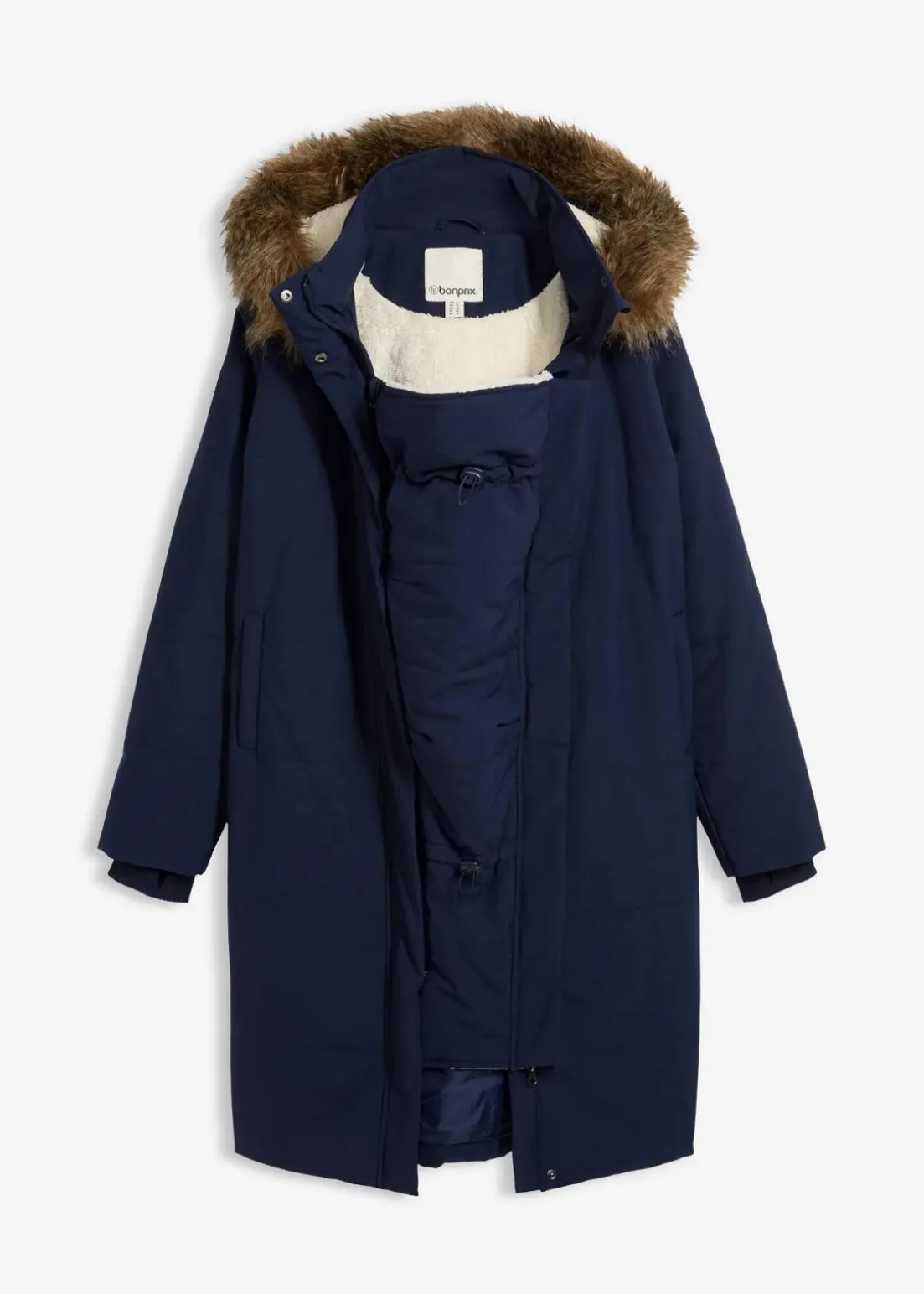 Regen- und windabweisender Steppmantel mit einem Trageeinsatz für das Baby. Mit Zweiwegereißverschluss vorne und seitlichen Reißverschlüssen zur Regulierung der Weite, die das Tragen sowohl in als auch nach der Schwangerschaft ermöglichen. Weiche Rippbündchen an den Ärmeln mit Daumenloch verhindern das Eindringen von Kälte und Wind. Mit praktischen Zippertaschen vorne. Die Kapuze hat einen abnehmbaren Fellbesatz. Kuschelig mit Teddyfleece gefüttert.