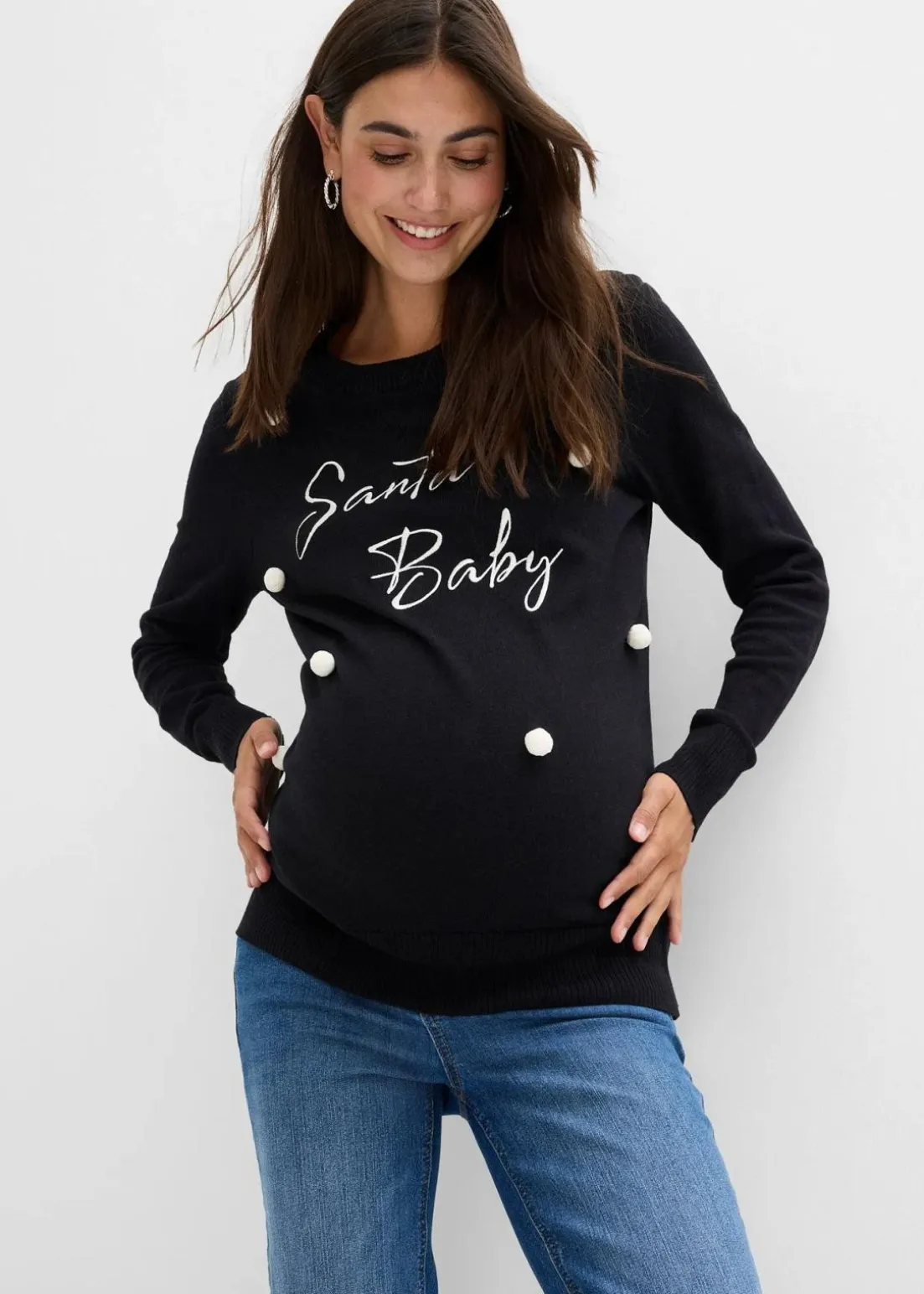 Dieser Umstandspullover bringt festliche Stimmung in deine Garderobe. Mit seinem „Santa Baby“-Stick und den verspielten Pompons sorgt er für einen besonderen Look. Der hüftbedeckende Regular Fit und die langen Ärmel bieten Komfort und Bewegungsfreiheit. Perfekt für die Feiertage – stylisch, gemütlich und ideal für deinen Babybauch.