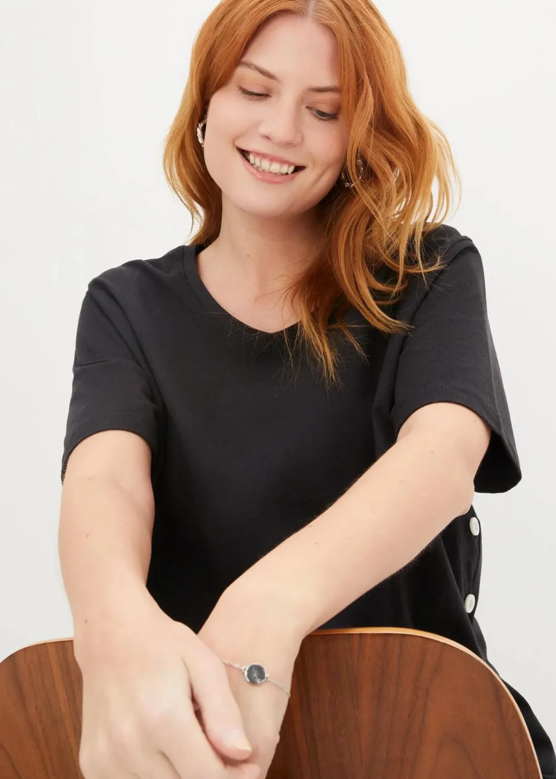 T-Shirt mit Knopfdetail an der Seite aus Bio-Baumwolle und V-Ausschnitt
