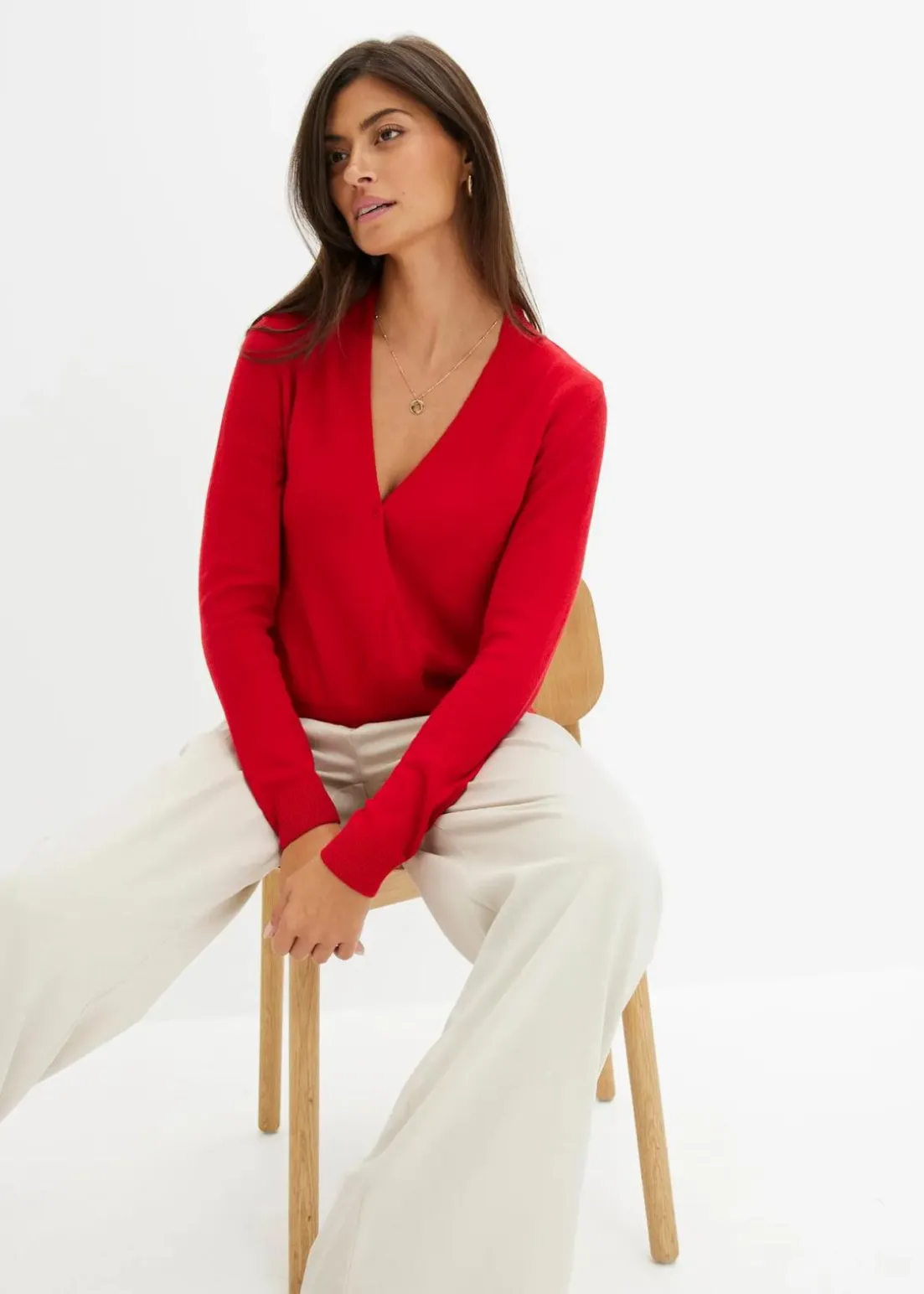 Figurschmeichelnder Wickel-Pullover mit breitem Bund am Saum.