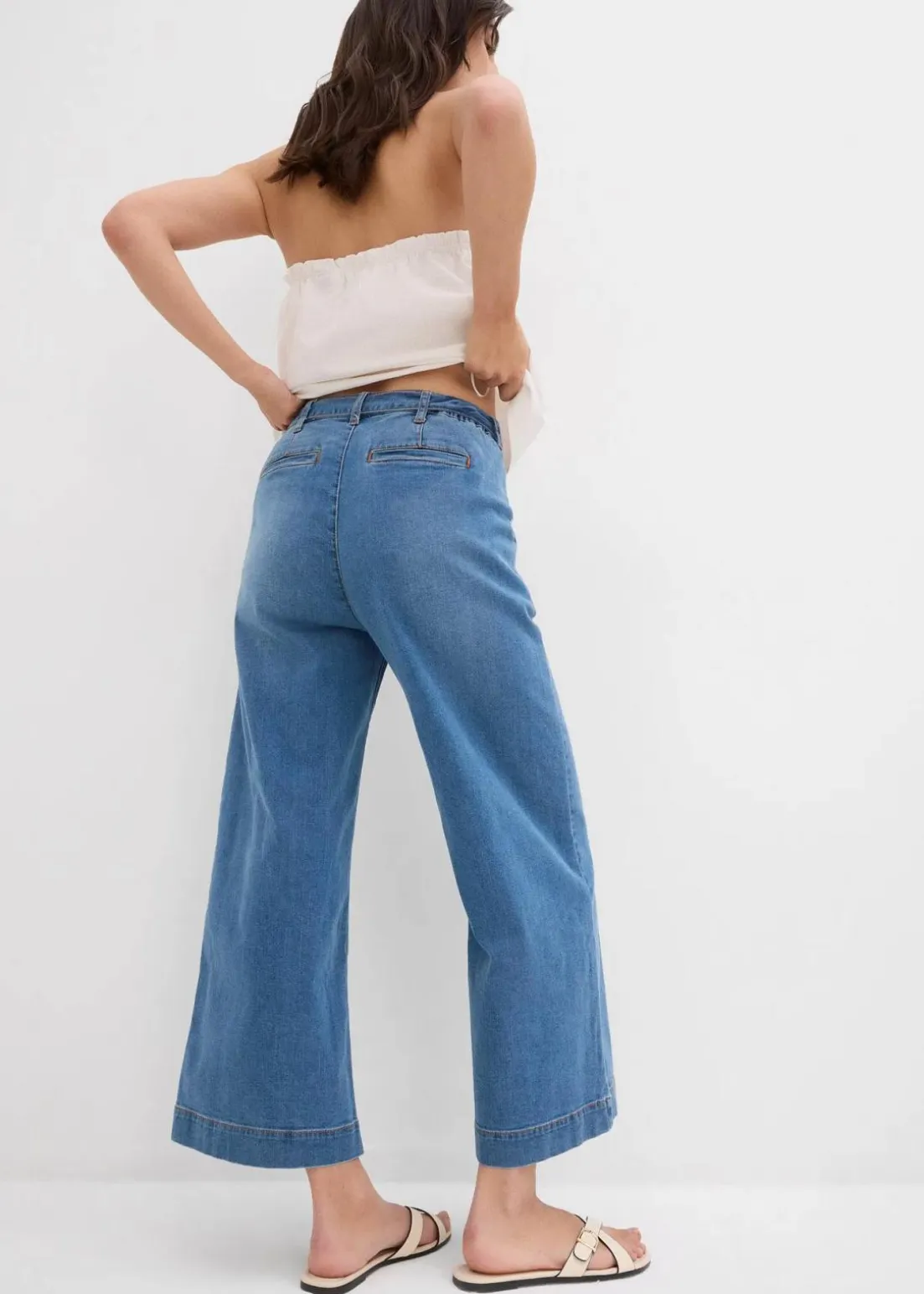 Besondere Details bringen die „weiten“ 7/8-Jeans von bpc attraktiv zur Geltung. Im Mittelpunkt steht der Bindegürtel. Die großen aufgesetzten Vordertaschen fallen ebenfalls auf. Ein breiter Saum schließt das Hosenbein ab. Die schöne Stretch-Culotte erhält mit einem seitlichen Teilgummibund einen wunderbaren Komfort. Die ansprechenden 7/8-Jeans überzeugen mit Bluse und Ballerinas auf feminine Weise. Etwas lässiger wirken sie mit einem Ringelshirt und Espadrilles.