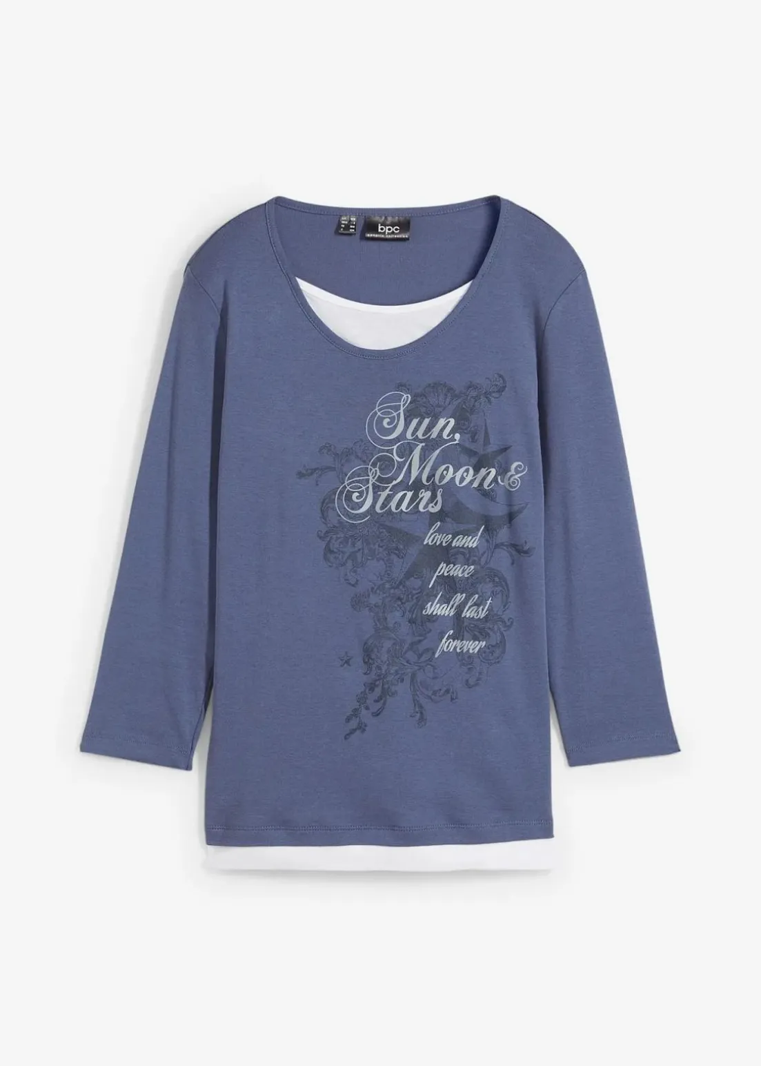 Dank seiner lockeren Passform schmeichelt das 2-in-1-Shirt mit 3/4-Ärmeln der weiblichen Linie. Die weiche Baumwollware und Schlitze an den Seiten sorgen bei dem Oberteil von bpc für angenehmen Tragekomfort.Das schöne Shirt erfreut mit einer attraktiven Doppeloptik. Durch andersfarbige Einlagen am Ausschnitt und dem Saum wirkt das Modell wie zwei übereinander getragene Shirts. Auf der Vorderseite setzt ein großflächiger Druck Akzente.