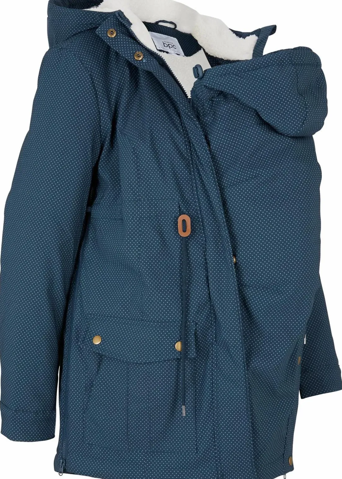 Seitliche Reißverschlüsse bieten zusätzliche Weite und ermöglichen die Jacke auch nach der Schwangerschaft weiterhin zu tragen. Ein abnehmbarer Trageeinsatz mit Kapuze schützt das Baby vor Wind und Wetter. Mit Zweiwegereißverschlus und Stehkragen mit Druckknöpfen. Mit einer Kapuze und Kordelzug unterhalb der Brust mit Kordelstoppern. Große, aufgesetzte Taschen und verstellbare Ärmelabschlüsse.