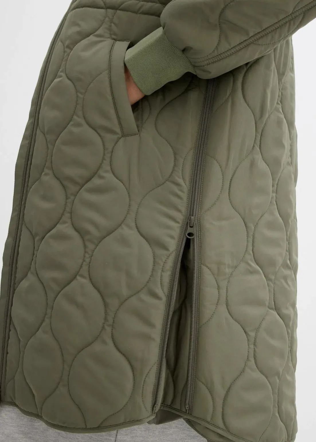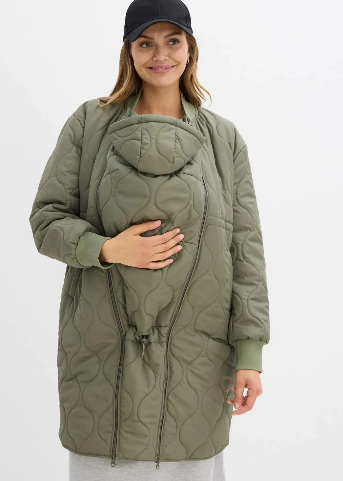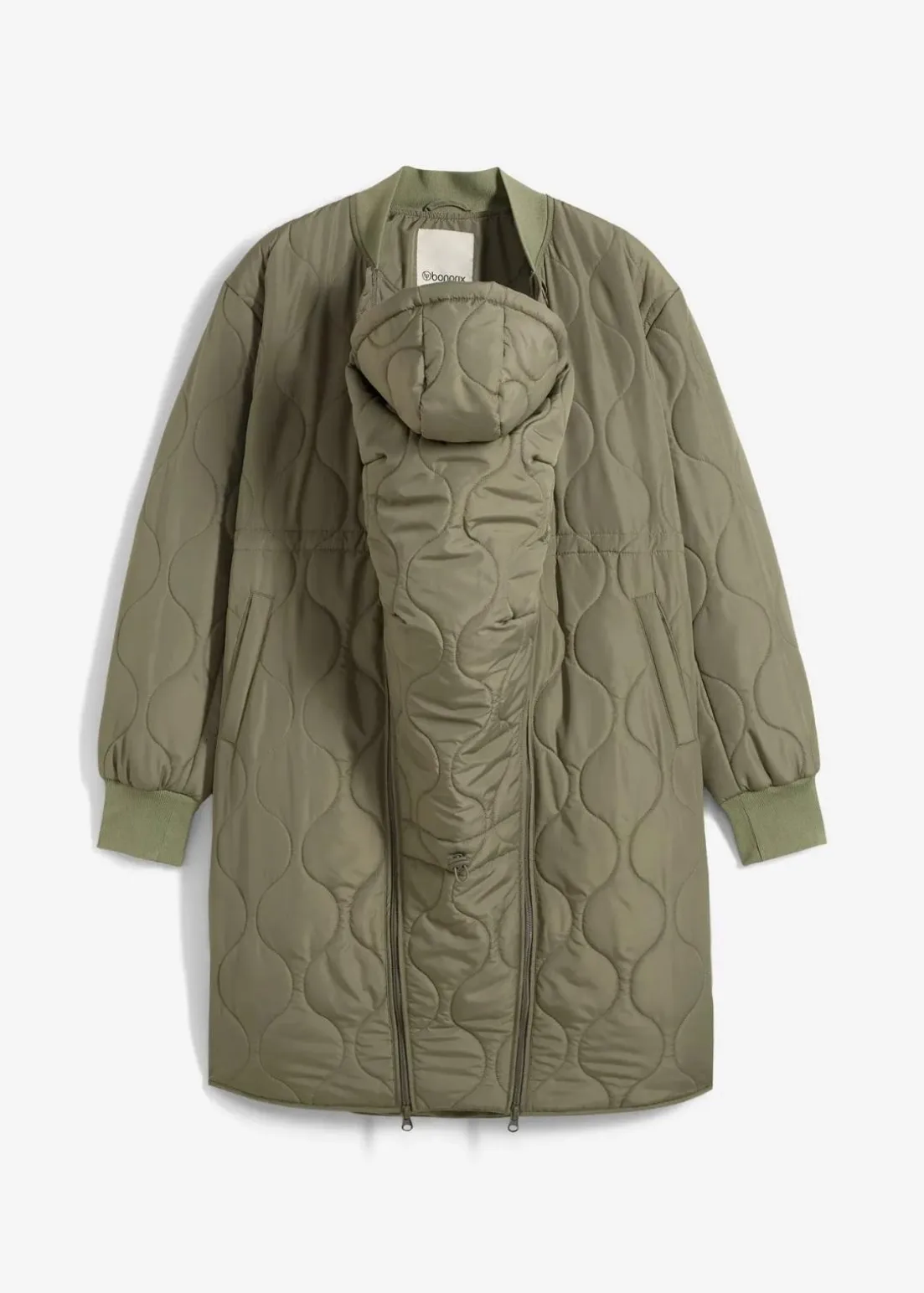 Steppmantel mit leichter Wattierung und seitlichen Reißverschlüssen zur Weitenregulierung, ideal für die Nutzung während und nach der Schwangerschaft. Ausgestattet mit einem Trageeinsatz samt Kapuze für das Baby. Die Ärmel und der Kragen verfügen über weiche, elastische Rippbündchen für zusätzlichen Komfort.