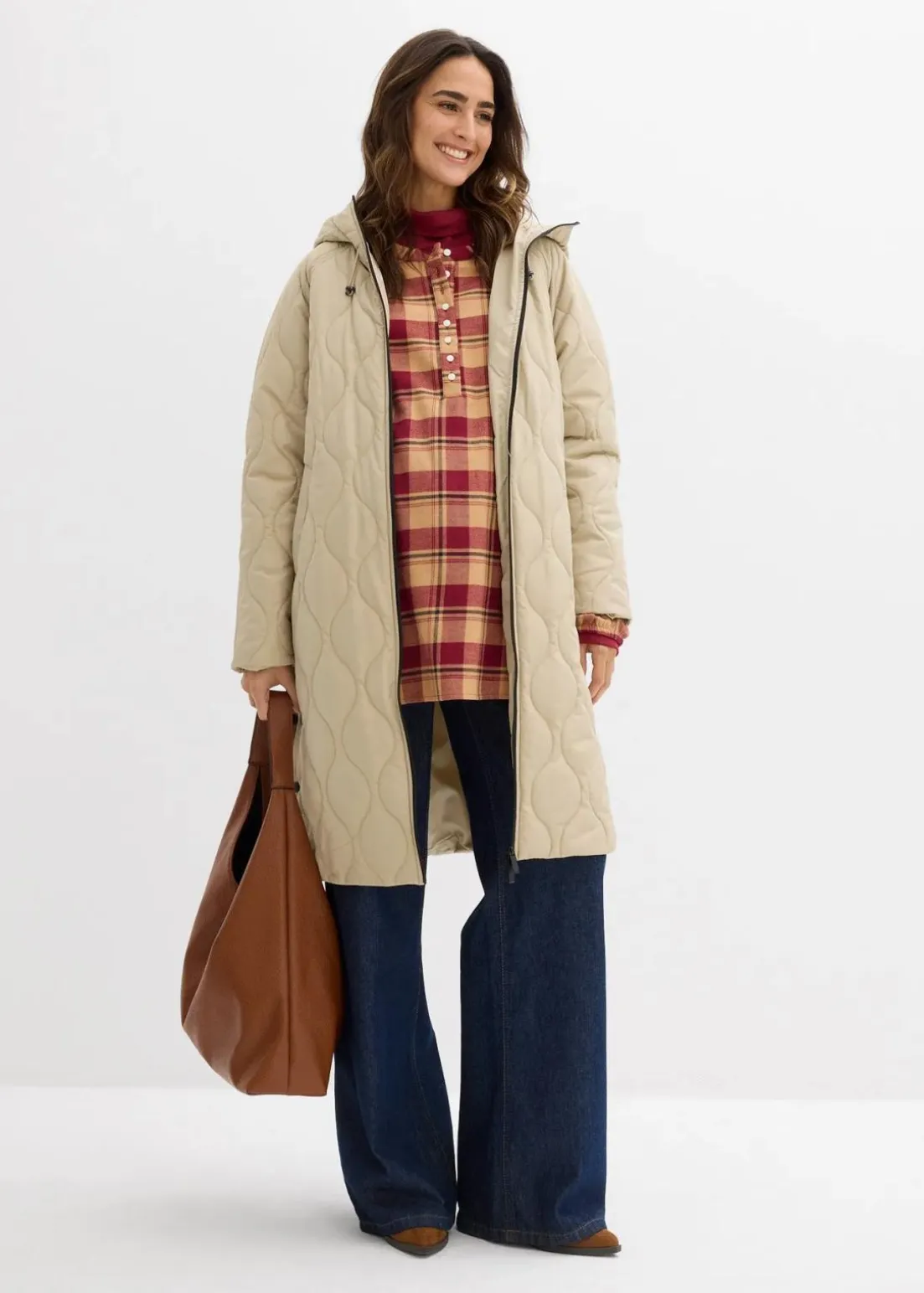 Praktischer Übergangsmantel in knieumspielender Länge mit funktionalen Kapuzen für Mutter und Baby, jeweils ausgestattet mit verstellbaren Kordelzügen. Druckknöpfe an den Seitennähten ermöglichen eine flexible Weitenanpassung und bieten so optimalen Komfort während der Schwangerschaft und danach.