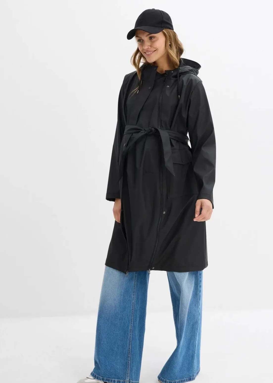 Der wind- und regendichte Umstandsmantel bietet optimalen Schutz für unbeständiges Wetter, sowohl für die Mutter als auch für das Baby. Die Regenjacke verfügt über zwei Einsätze: einen Erweiterungseinsatz für die Schwangerschaft und einen Trageeinsatz für das Baby, der mit einer kleinen Kapuze ausgestattet ist. Auch die Mutter wird durch eine große Kapuze geschützt. Zusätzlich bietet der Mantel große aufgesetzte Taschen und ein abnehmbares Bindeband zur individuellen Weitenregulierung. Luftlöcher unter den Armen sorgen für eine angenehme Belüftung.