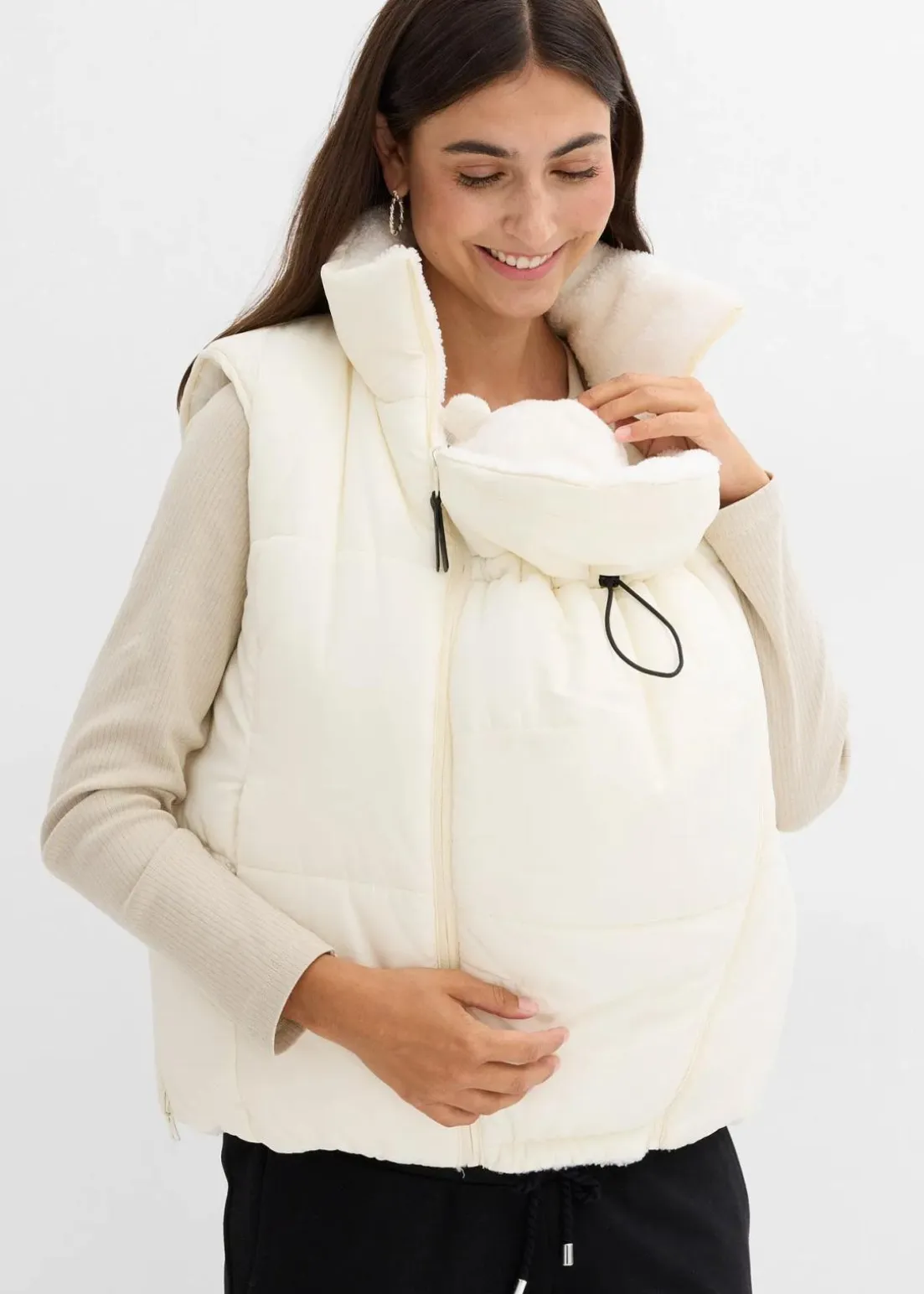 Wendeweste mit zwei praktischen Seiten: eine kuschelige Teddyseite und eine wasserabweisende Außenseite.Auch der praktische Trageeinsatz ist beidseitig nutzbar, mit einer weichen Teddy- und einer wasserabweisenden Seite.Seitliche Reißverschlüsse lassen sich öffnen und bieten bei Bedarf mehr Platz für den wachsenden Babybauch.
