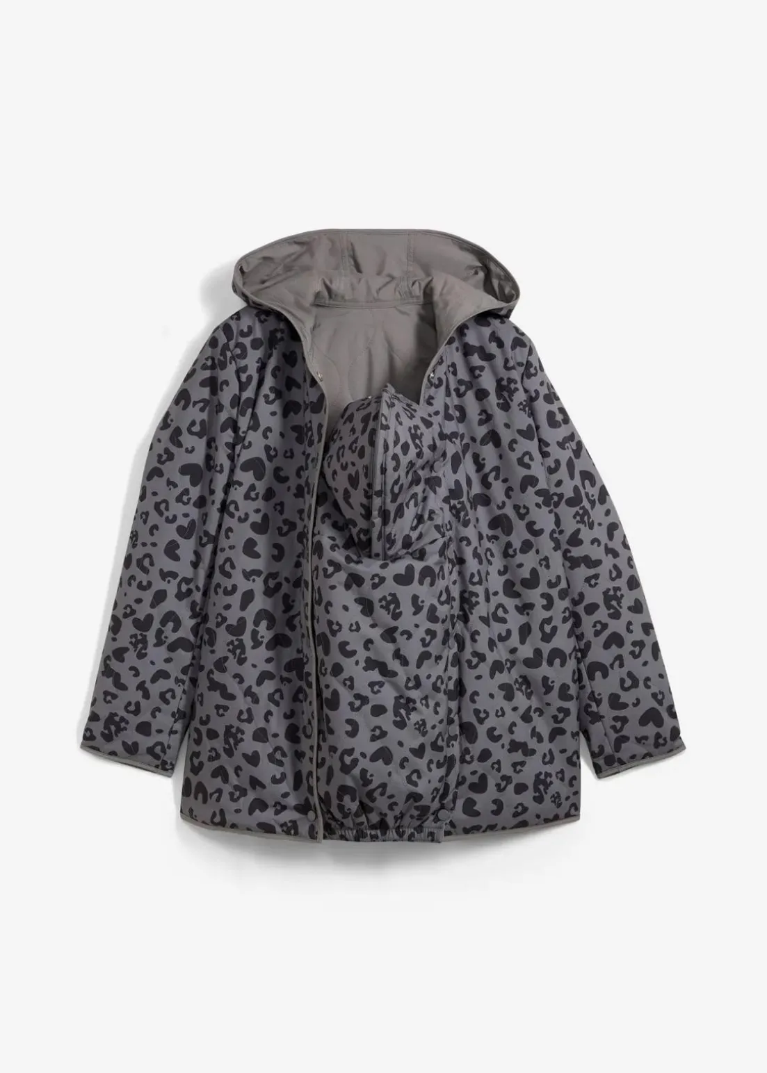 Modische und multifunktionale Jacke, die beidseitig getragen werden kann. Die Wendejacke ist leicht wattiert und hat eine bedruckte und eine unifarbene Seite, die jeweils über Taschen verfügen. Der abgerundete Saum mit Schlitzen an den Seitennähten und ein elastischer Gummizug in der hinteren Taille ermöglichen sie in der Schwangerschaft als auch danach zu tragen. Der praktischem Babyeinsatz hat eine Kapuze, die sich mit einem Reißverschluss öffnen lässt. So kann das Baby in Ruhe schlafen und ist vor Wind und Wetter geschützt.