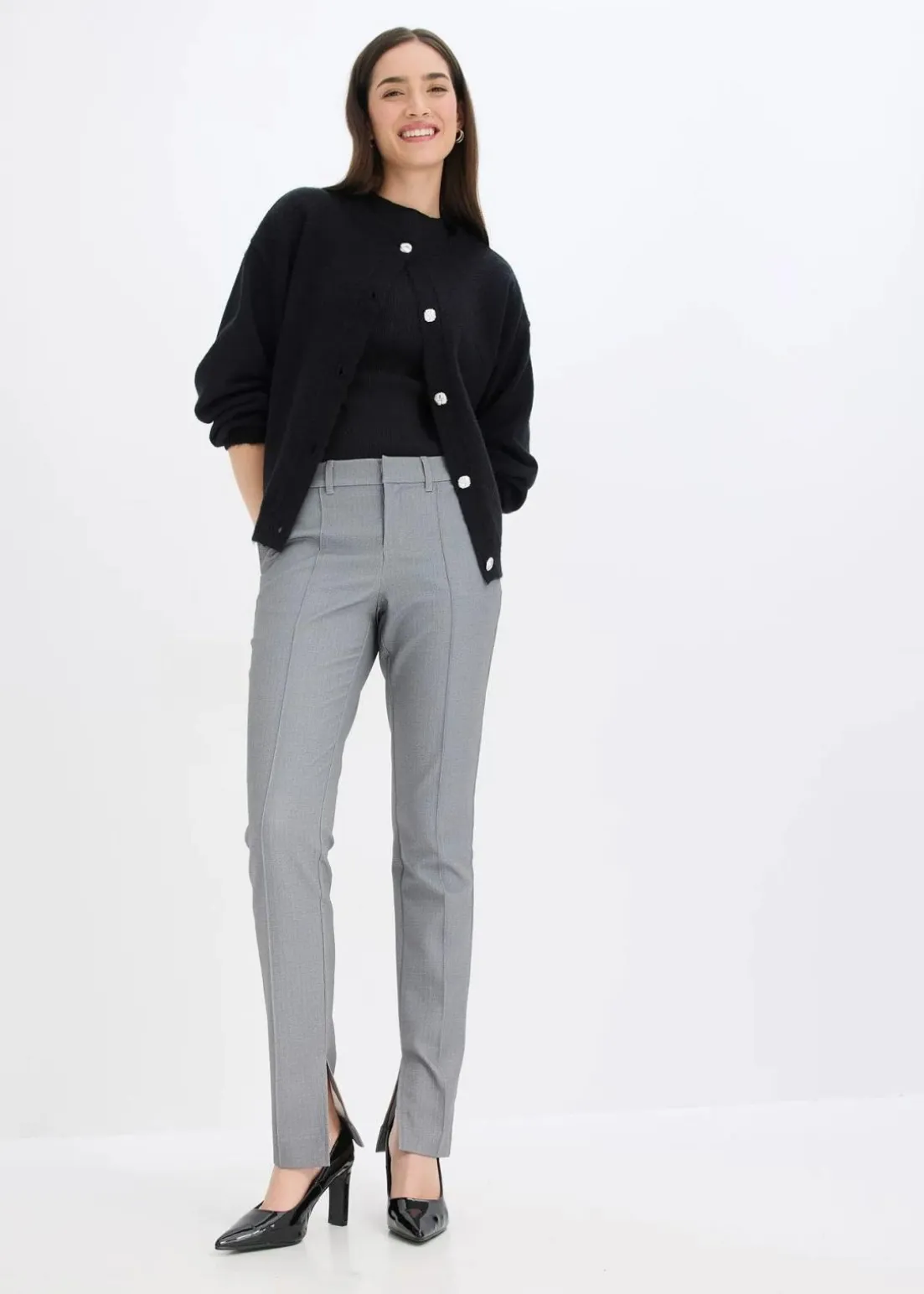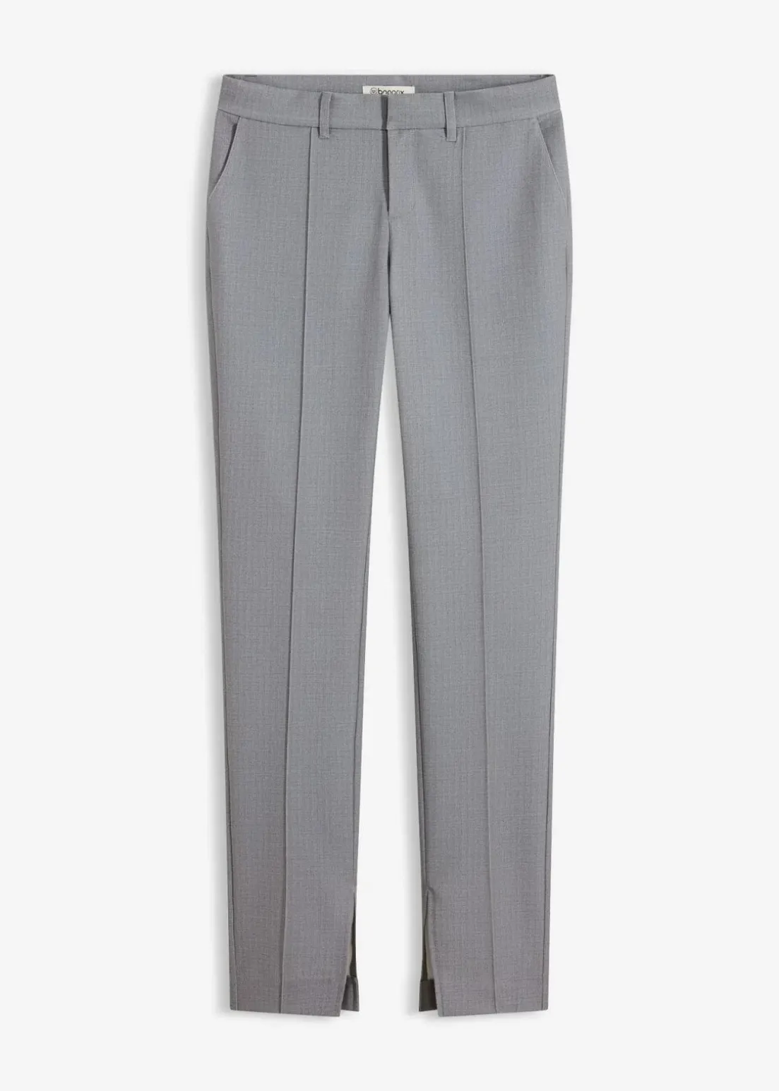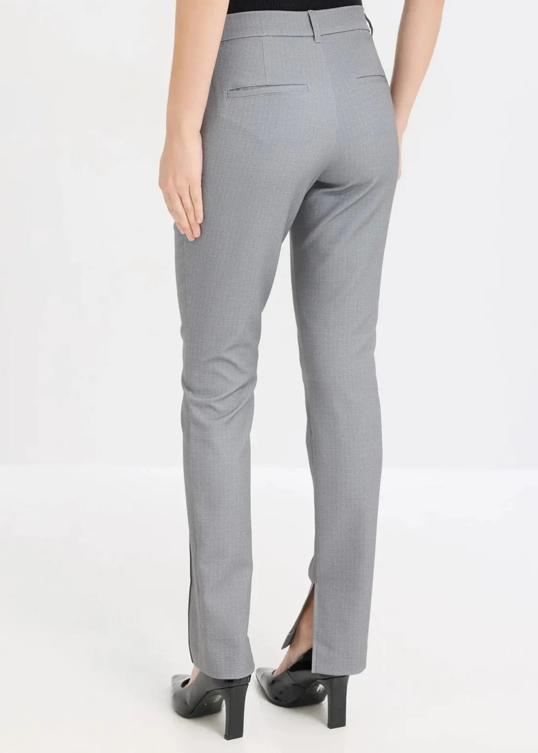 Schmale Hose mit Seitentaschen, verdeckter Knopf-, Haken- und Reißverschluss, Schlitze im Innenbein und Gürtelschlaufen.