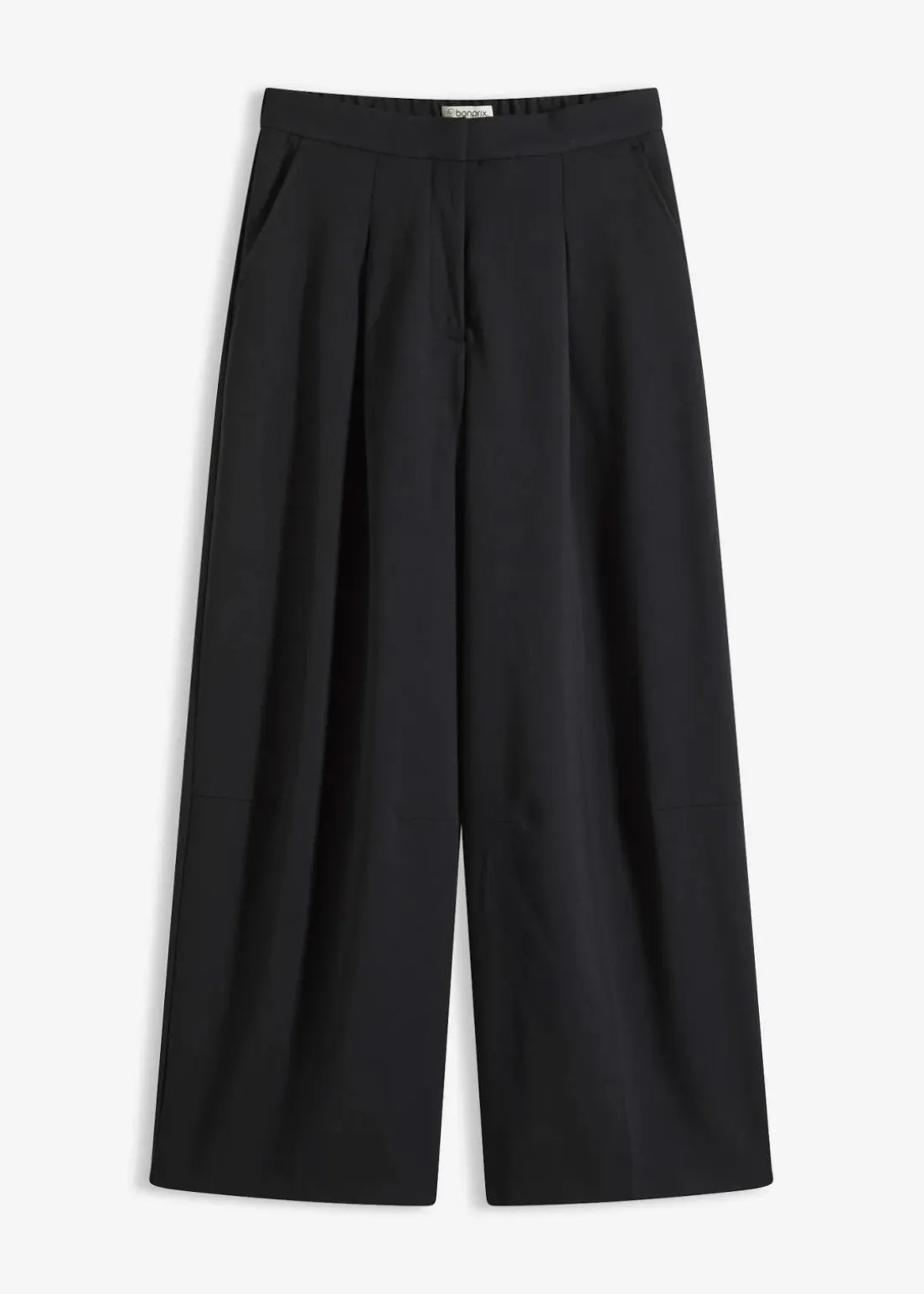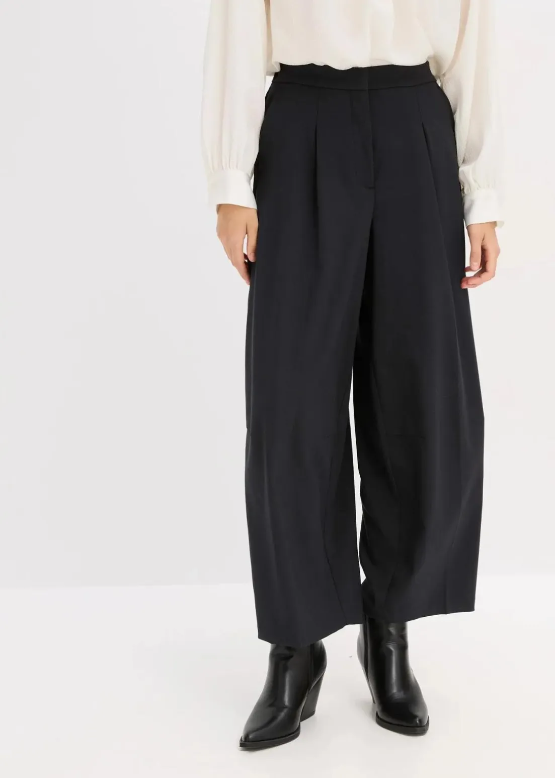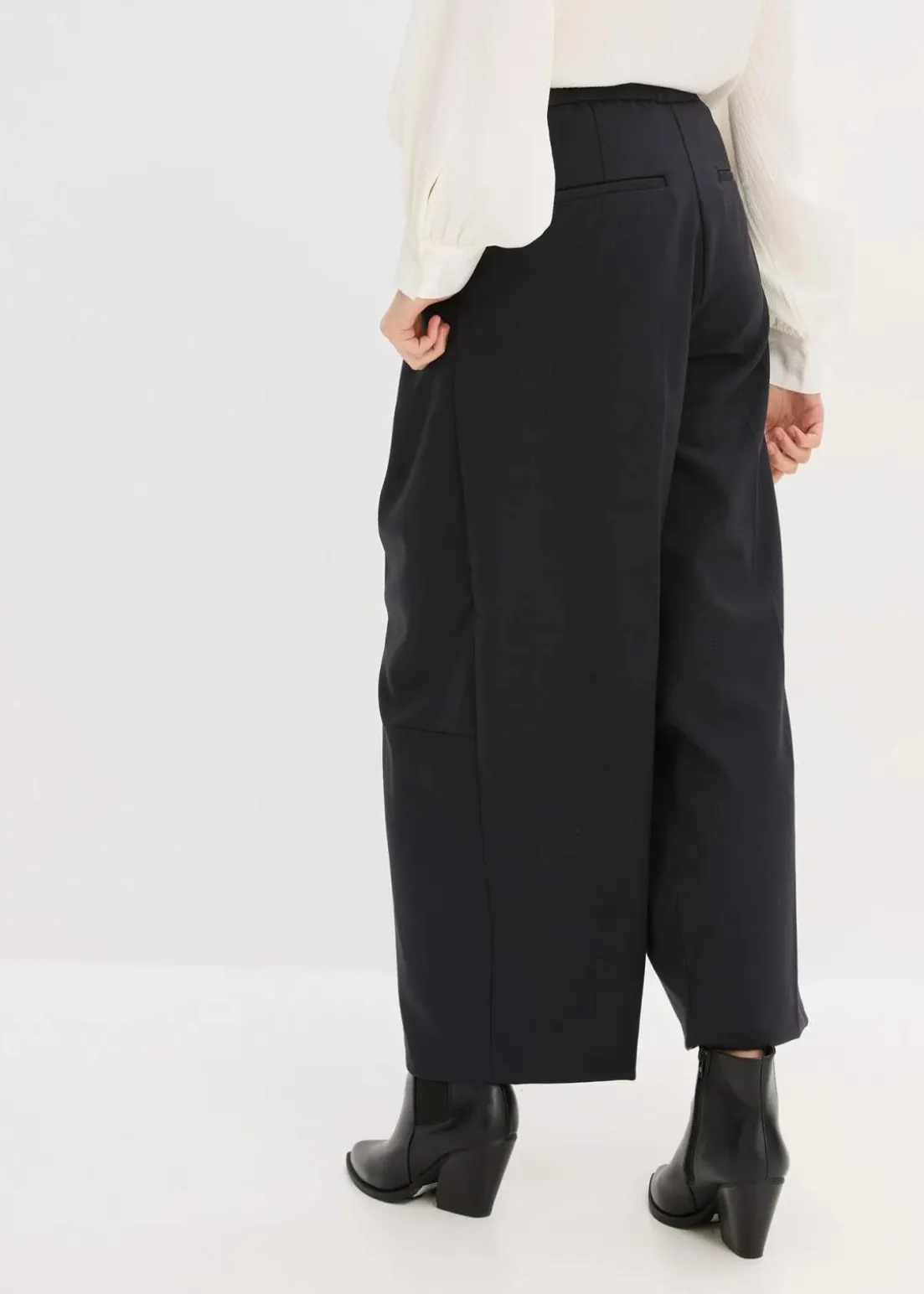 Bundfalten Hose in leichter Barrelform mit seitlichen Taschen sowie teilelastischem Bund mit Zip Fly und verdecktem Häkchenverschluss vorn.