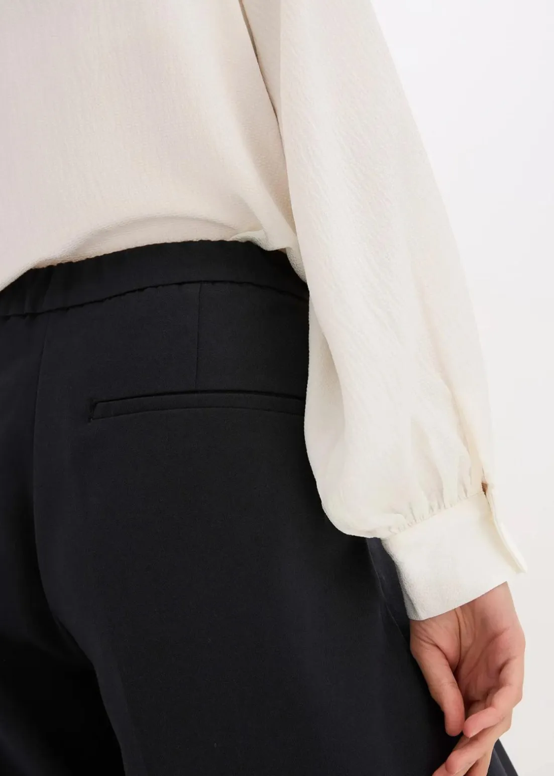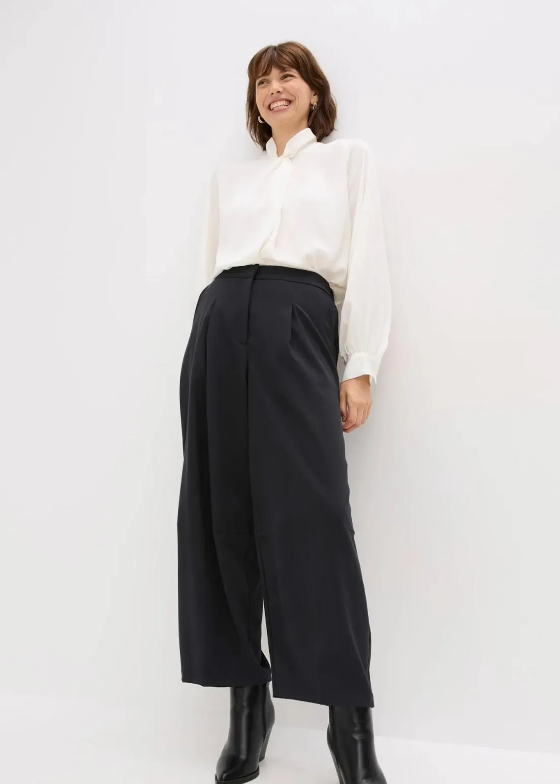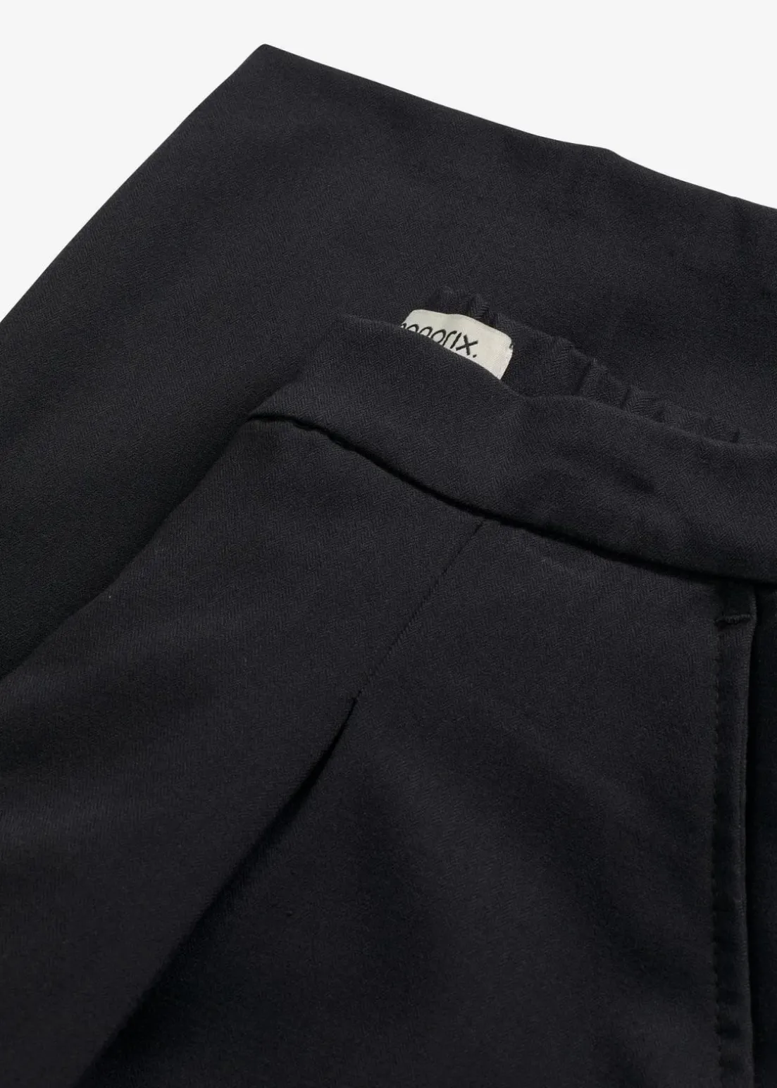 Bundfalten Hose in leichter Barrelform mit seitlichen Taschen sowie teilelastischem Bund mit Zip Fly und verdecktem Häkchenverschluss vorn.