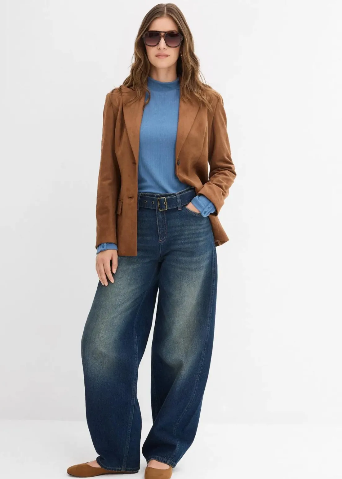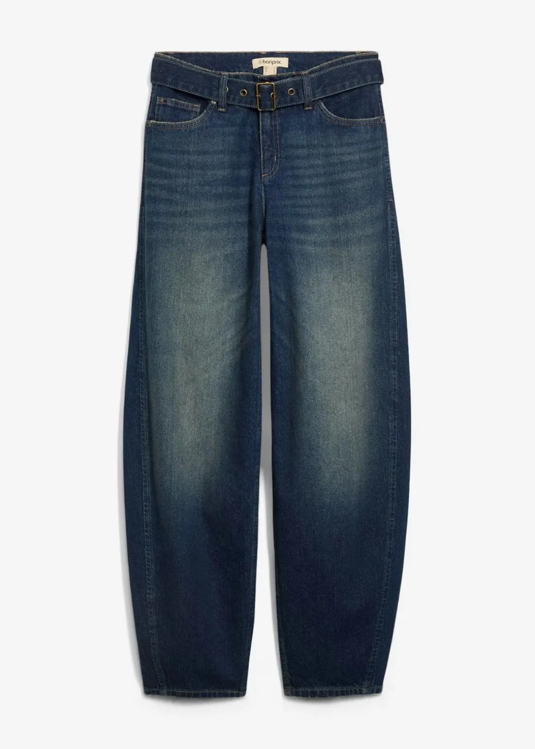 5-Pocket-Jeans aus einem festen Baumwolldenim, der sich zunächst etwas steif anfühlt und durch häufiges Tragen weicher und lockerer wird. Lockerer Passform mit voluminösem, gerundetem Bein von Hüfte bis Oberschenkel und schmal zulaufendem Schnitt abwärts. Lange Länge, dass am Fuß ein leichter Stacking-Effekt entsteht. Diese Jeans (blau denim) hat durch das ausgewaschene Finish einen modischen Used-Effekt erhalten. Eine leichte Farbabgabe beim Tragen und in der Wäsche sind charakteristisch für diese Jeans.