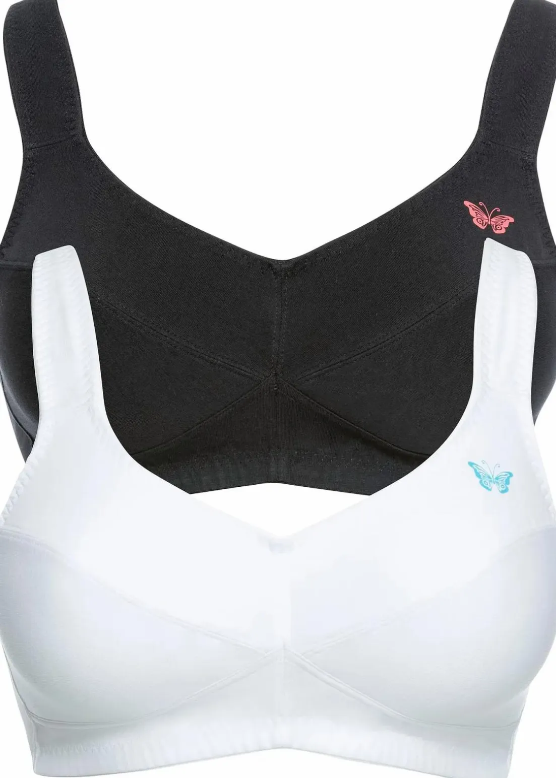 Dieser BH aus Bio-Baumwolle begeistert mit hohem Tragekomfort. Er ist bügellos gearbeitet und mit breiten, gepolsterten Trägern versehen. Ein kleiner Schmetterlingsprint ziert den BH. Er wird im praktischen Vorteilspack geliefert und ist der perfekte Begleiter für jeden Tag.