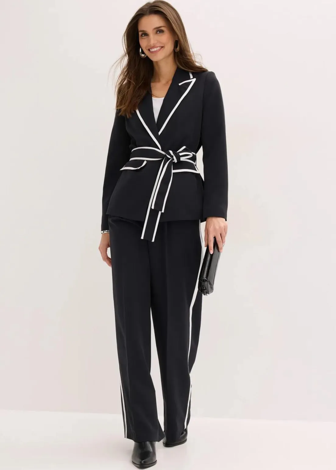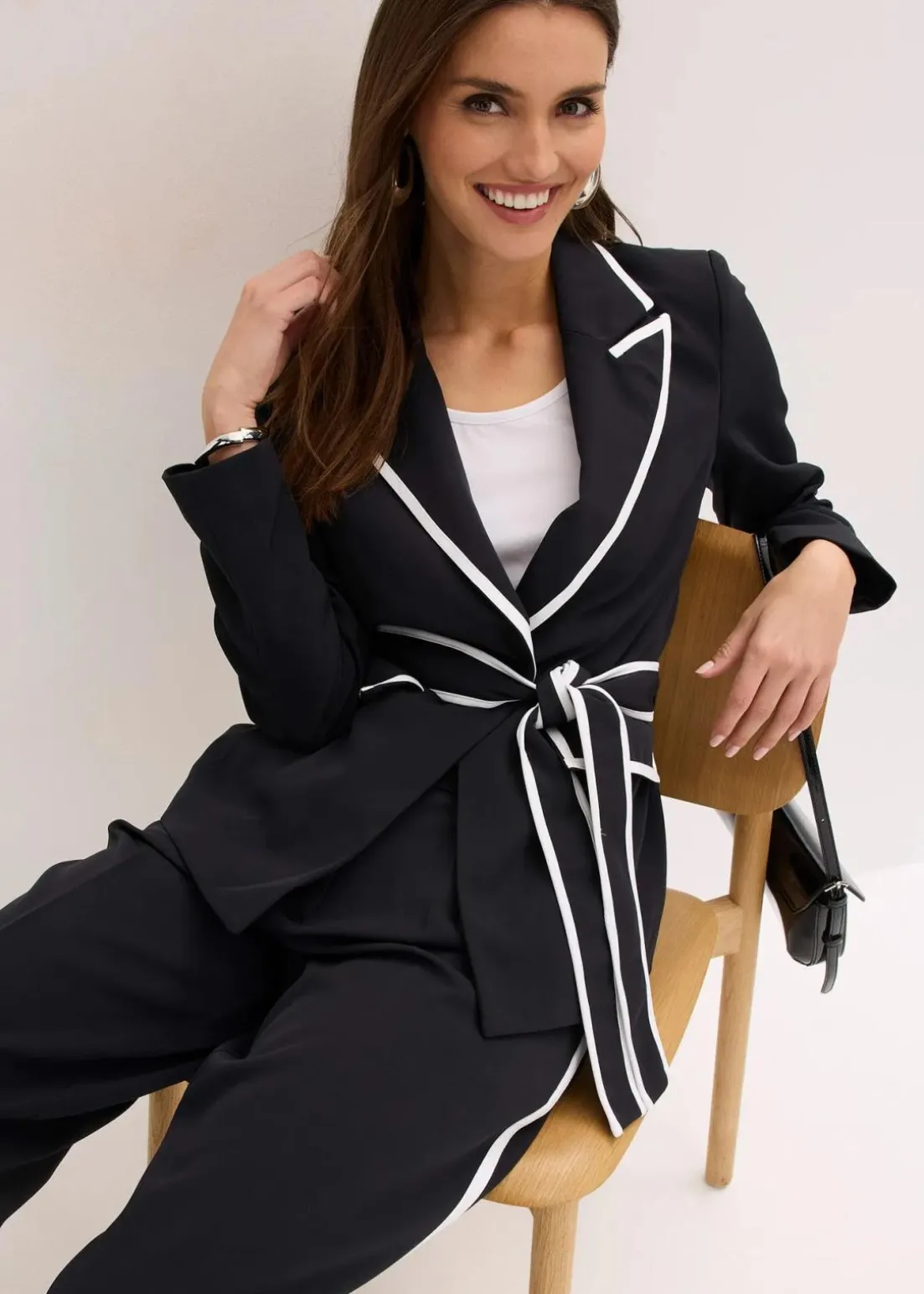 modischer Blazer mit Taillengürtel und Paspelierungen in Kontrastfarbe