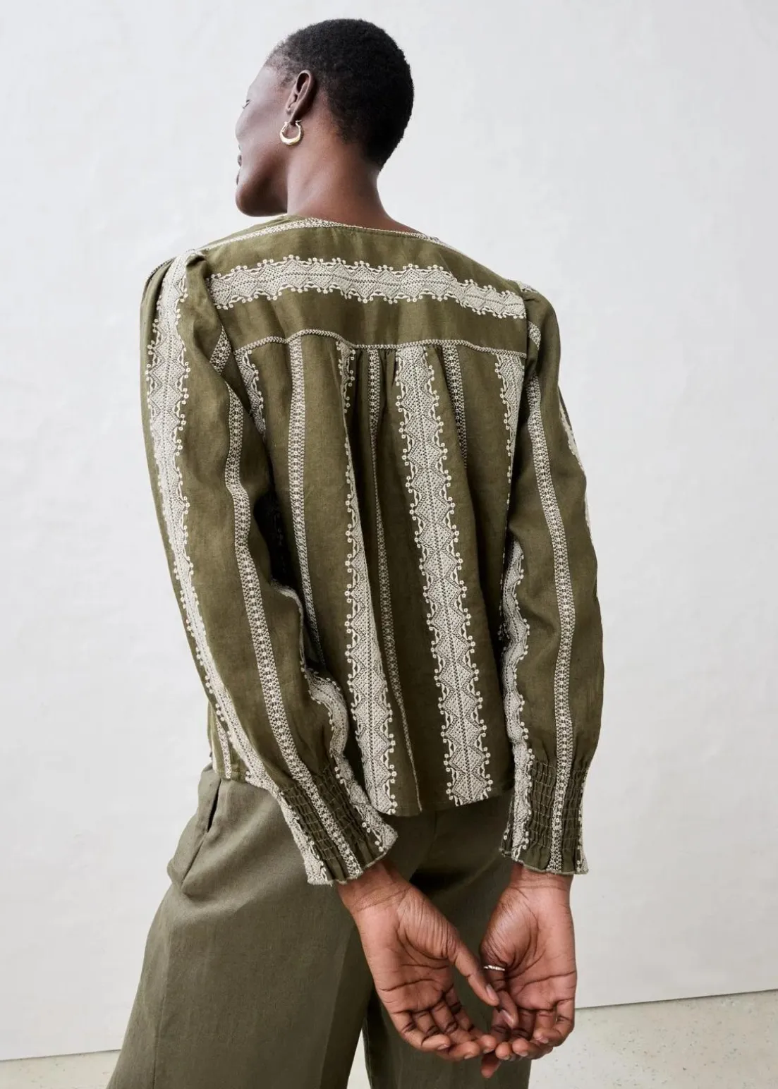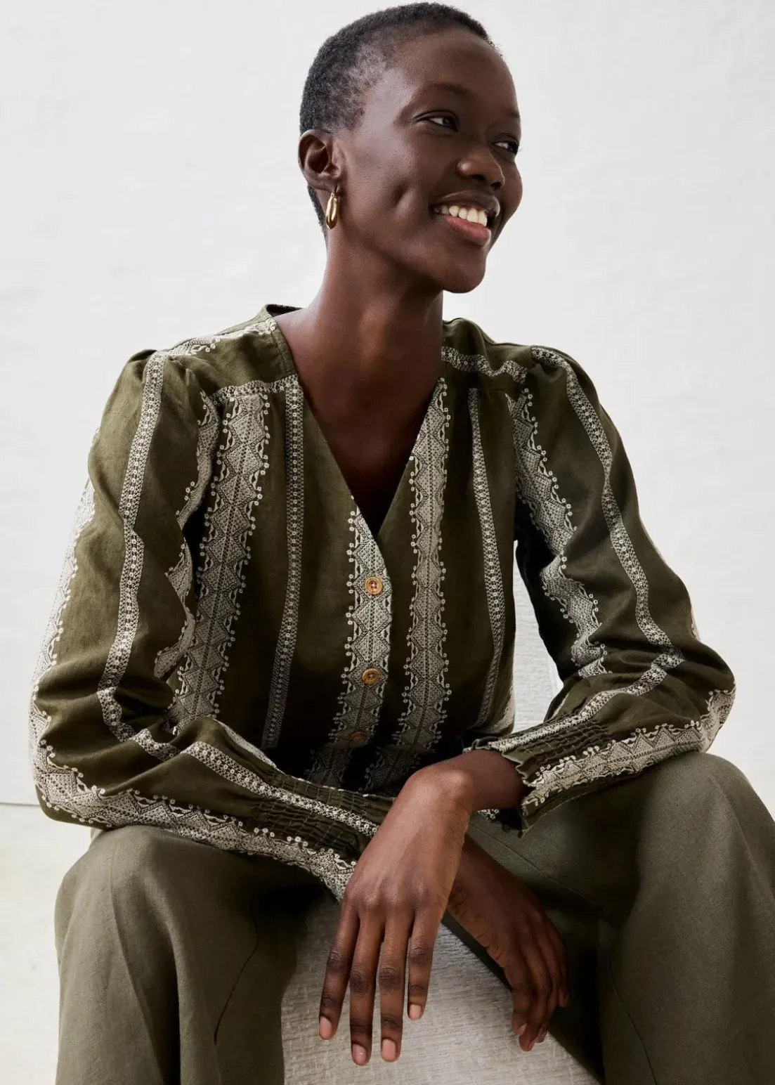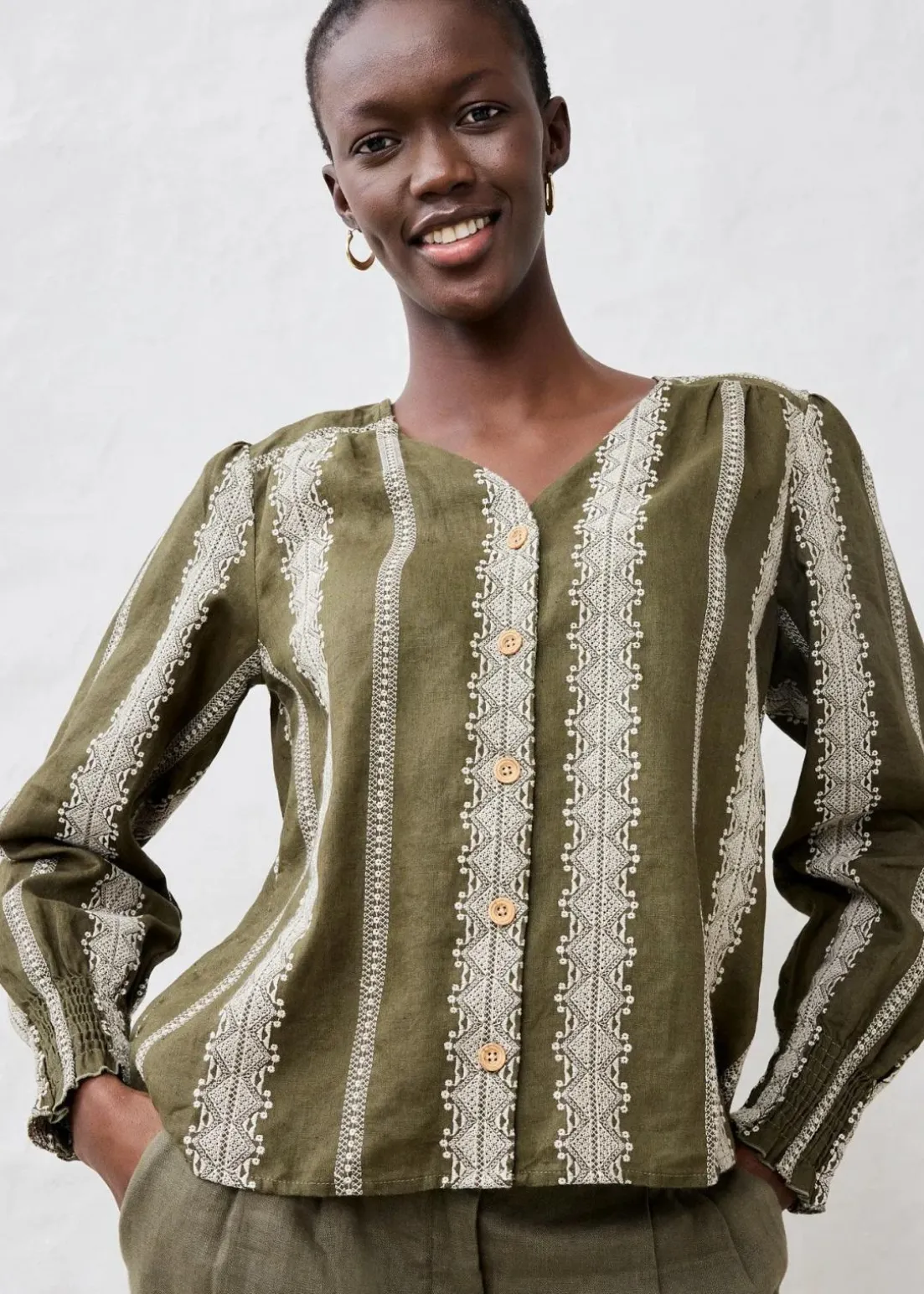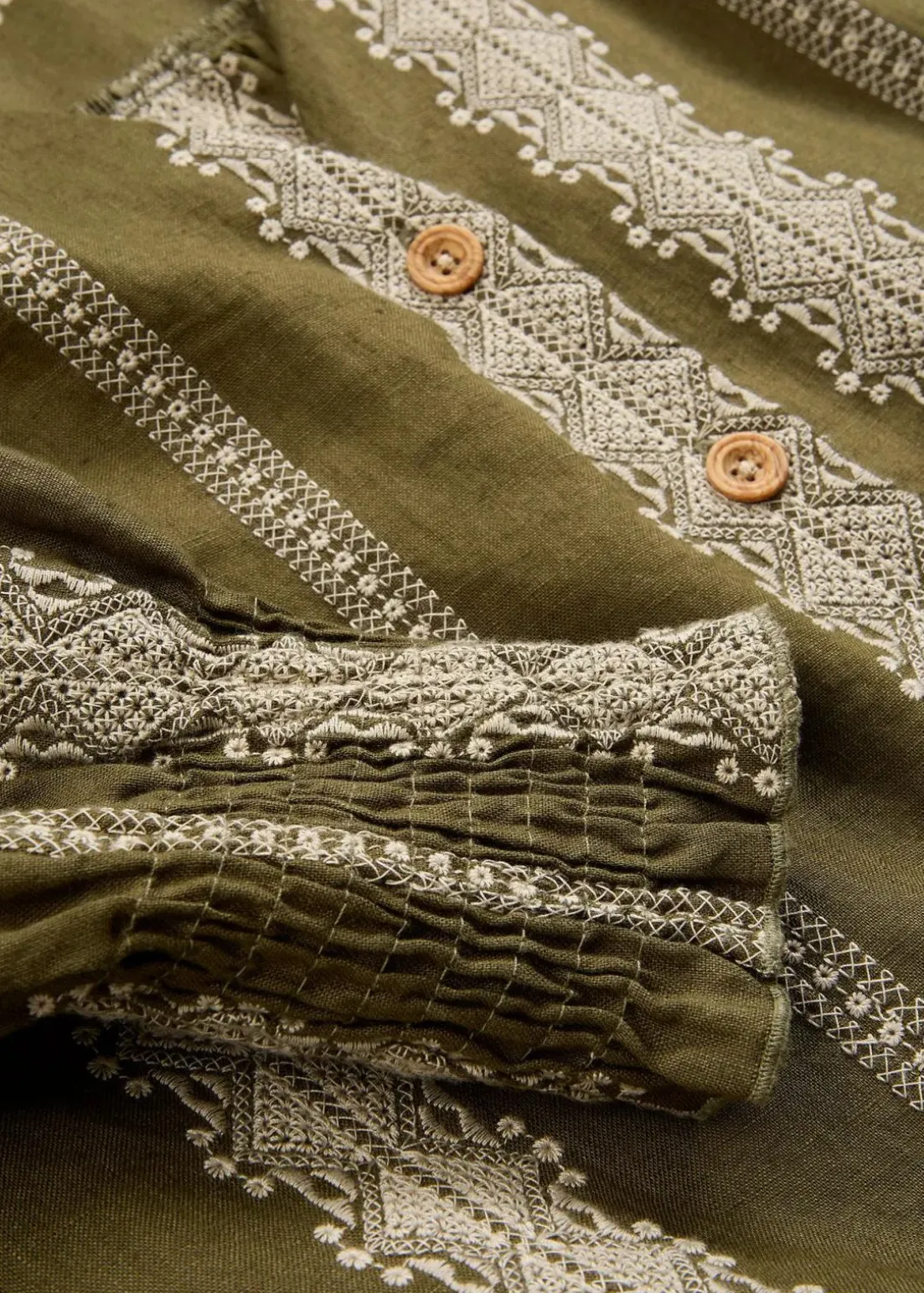 aparte Leinenbluse mit dekorativer Stickerei und Knöpfen in Holzoptik