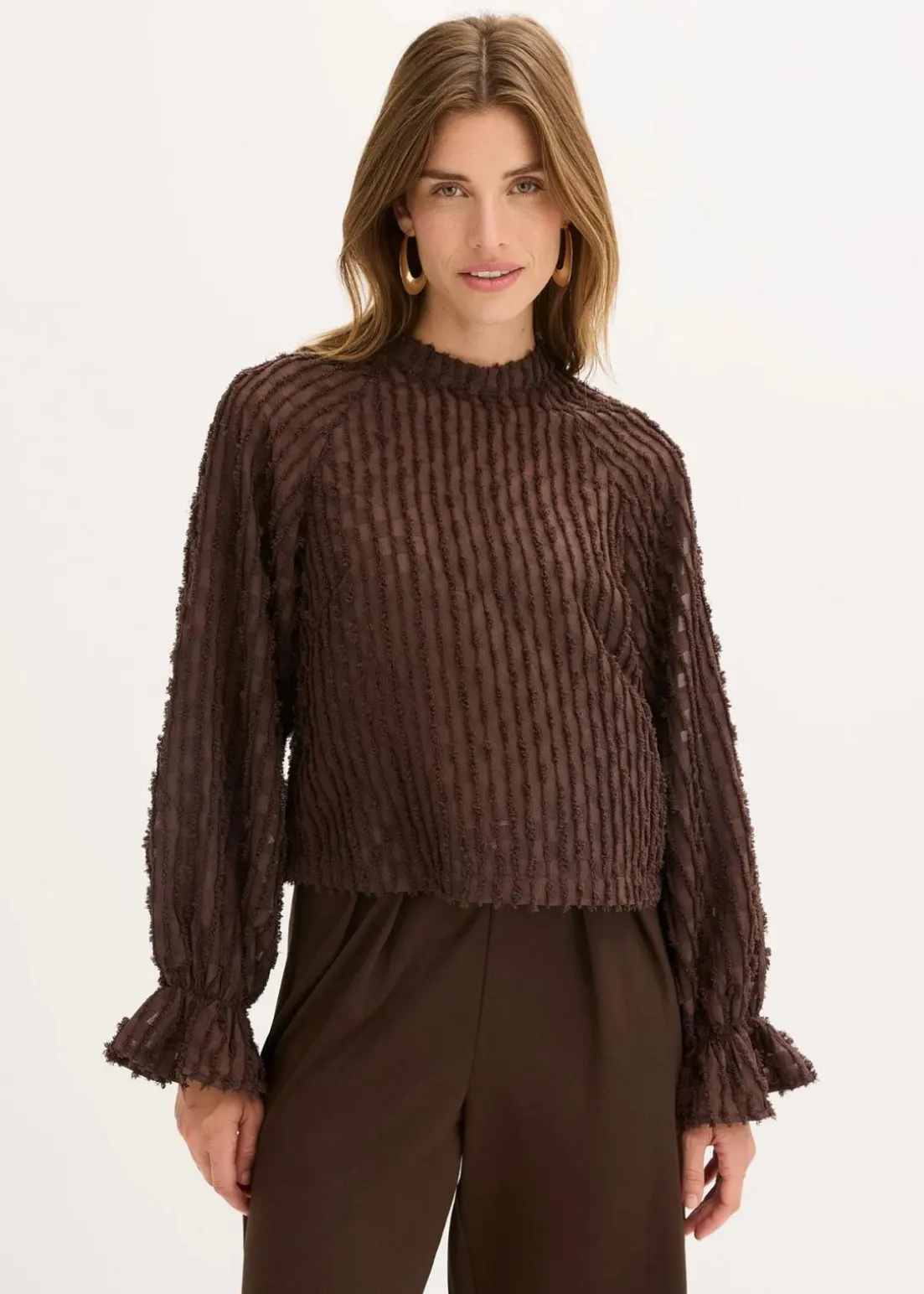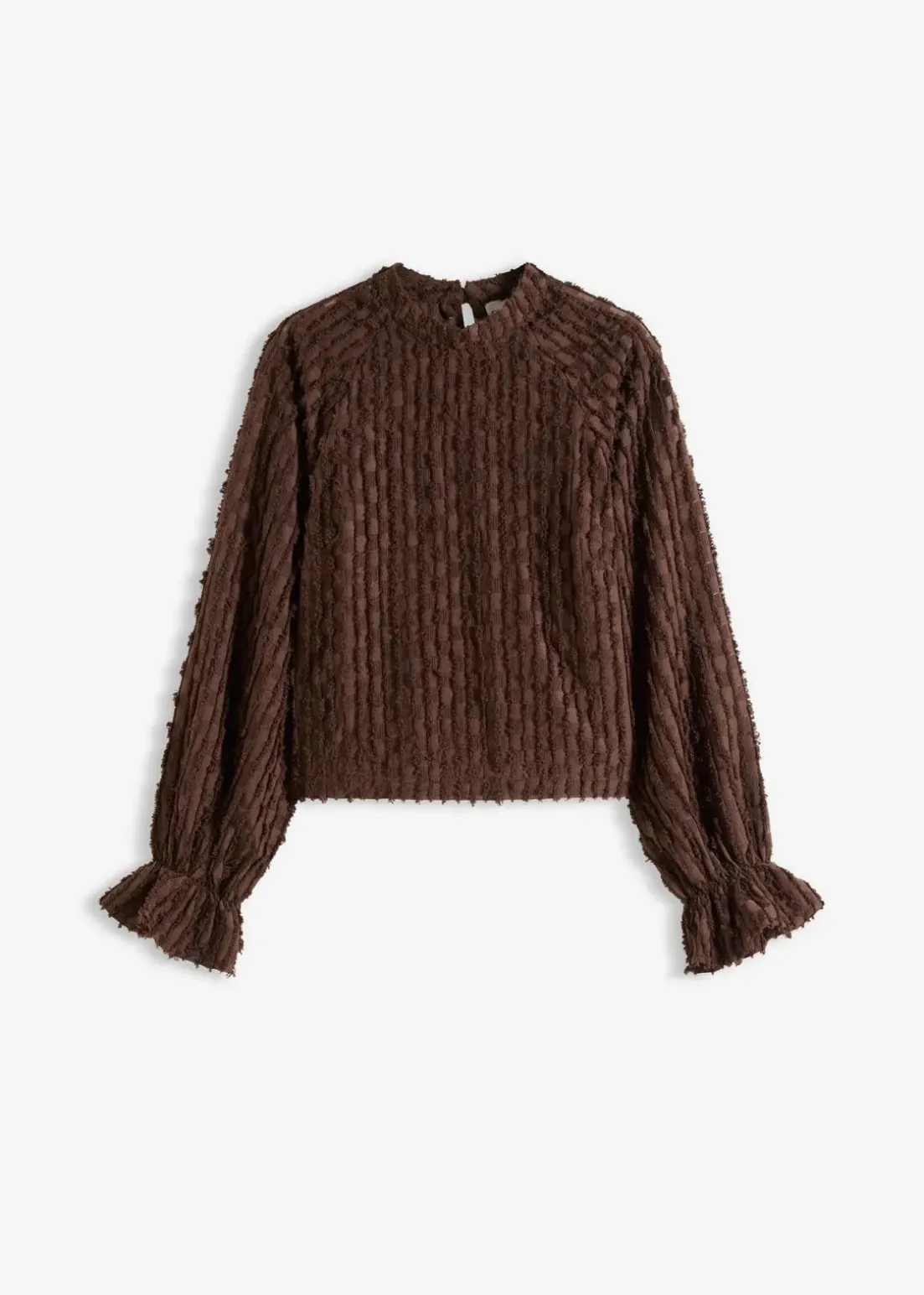 Blusentop mit kleinem Stehkragen und elastischem Rüschenabschluss am Ärmel