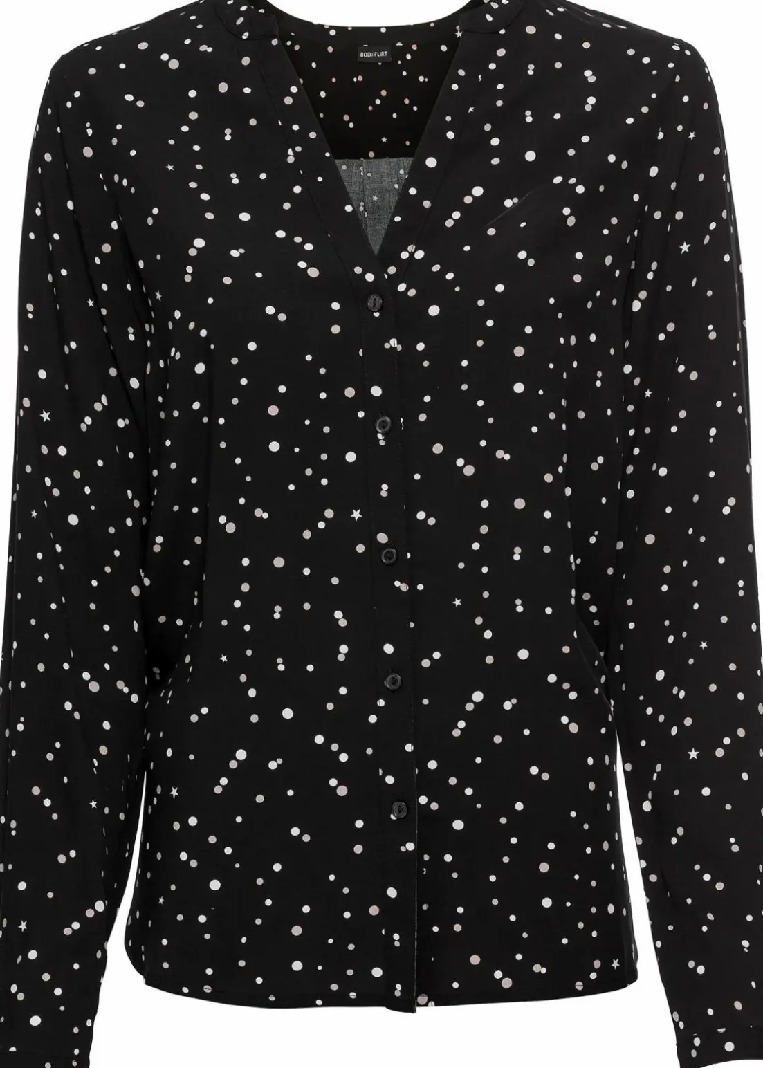 Attraktive Pünktchenbluse mit Knopfleiste und reizendem V-Ausschnitt.