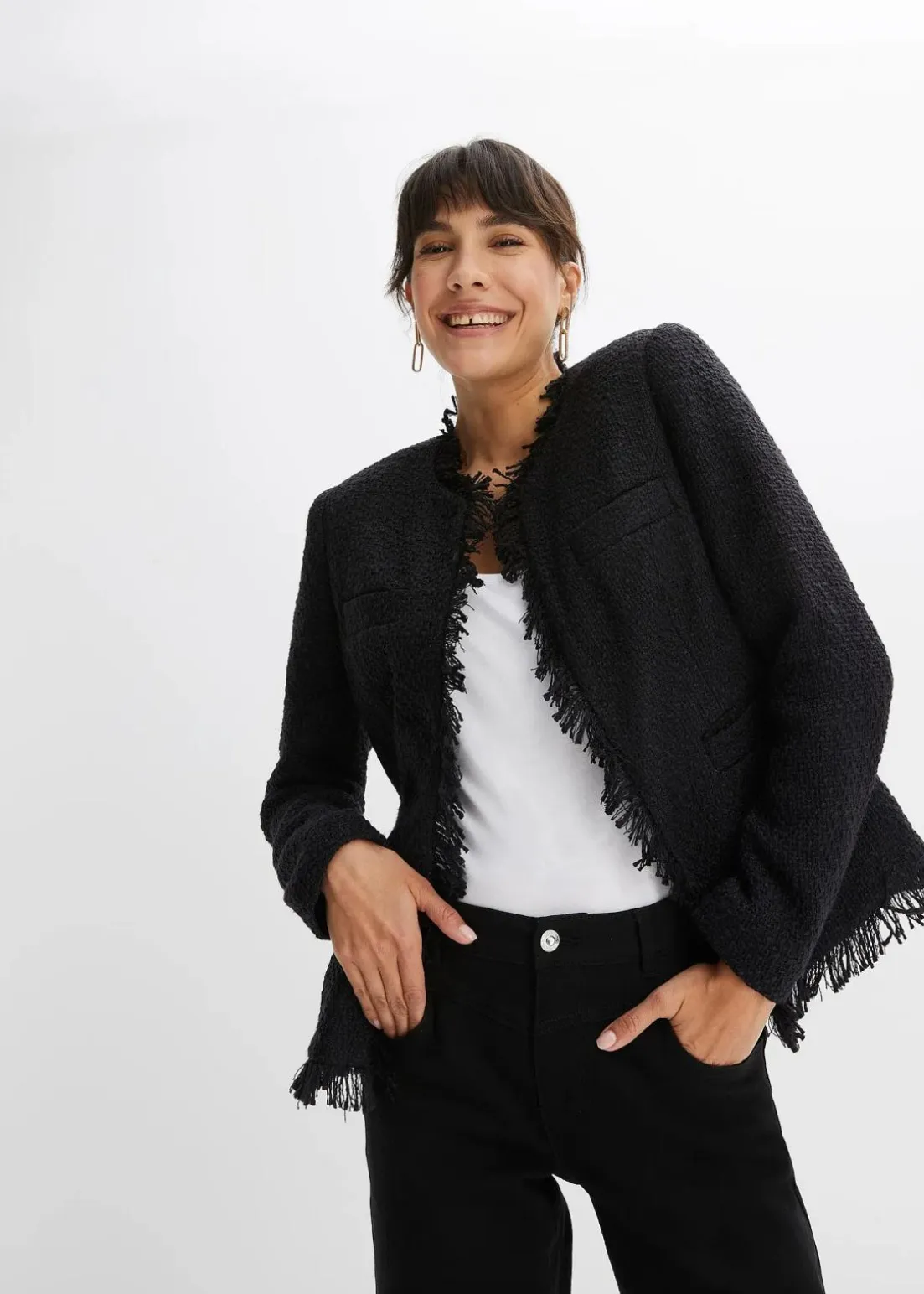 Modische Bouclé-Jacke mit dekorativen Fransen verziert.
