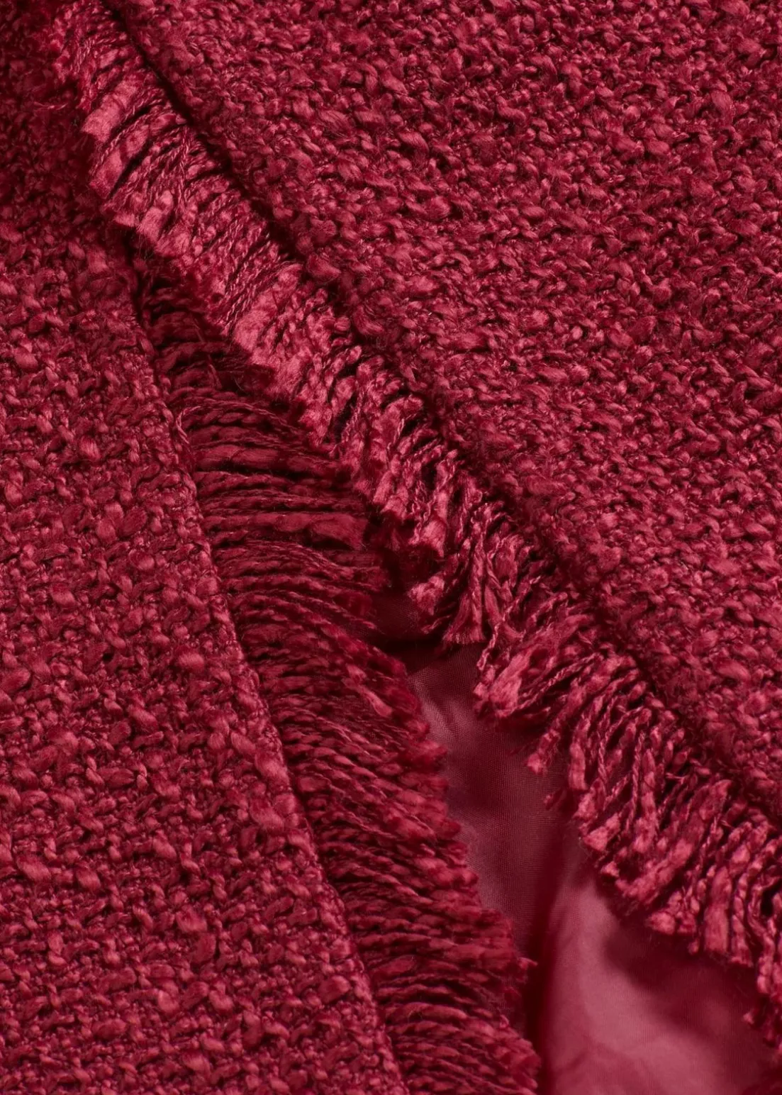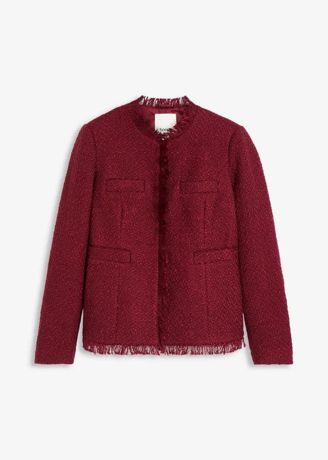 Modische Bouclé-Jacke mit dekorativen Fransen verziert.