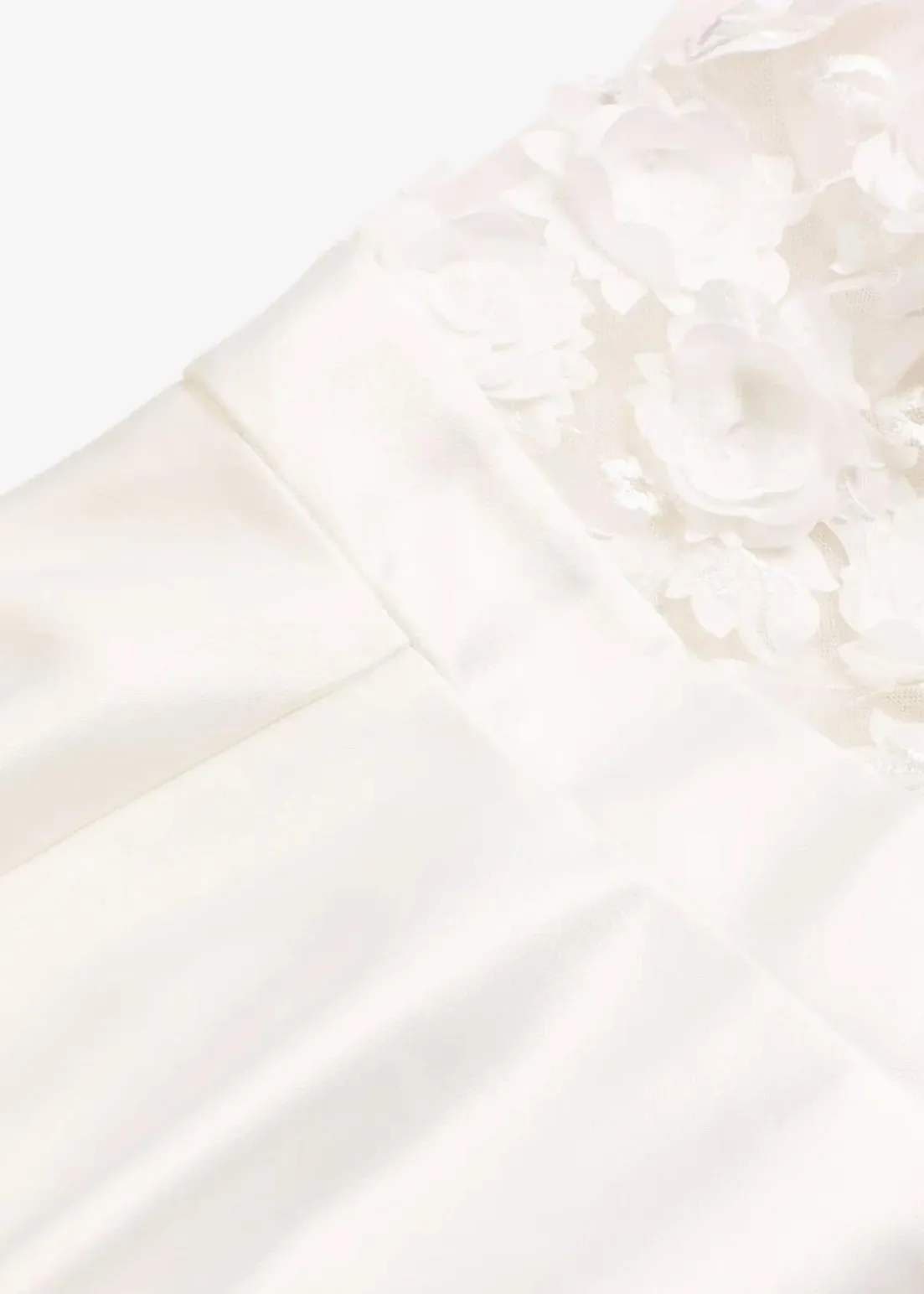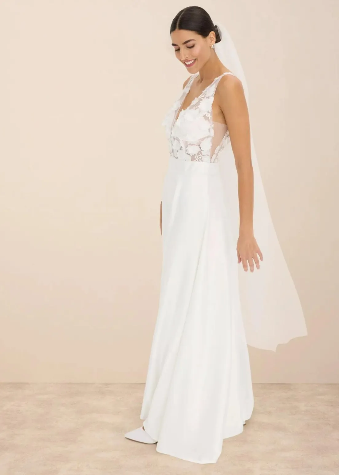 Modern und feminin: Langes Brautkleid aus glänzendem Satin mit hohem Schlitz und Blumen-Applikation im Oberteil