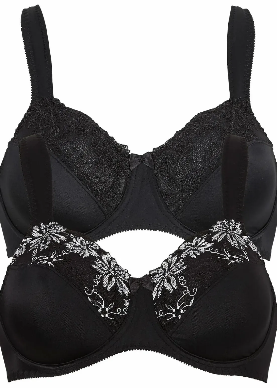 Gleich doppelt wird der schöne BH geliefert. Die attraktive Stickerei im oberen Bereich des Cups umrahmt das Dekolleté besonders charmant. Die Schultern erfahren durch die gepolsterten Träger eine angenehme Entlastung, der BH hat zudem eingearbeitete Bügel.