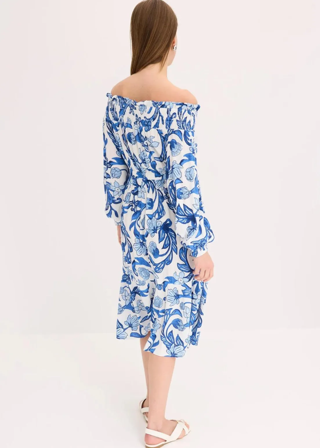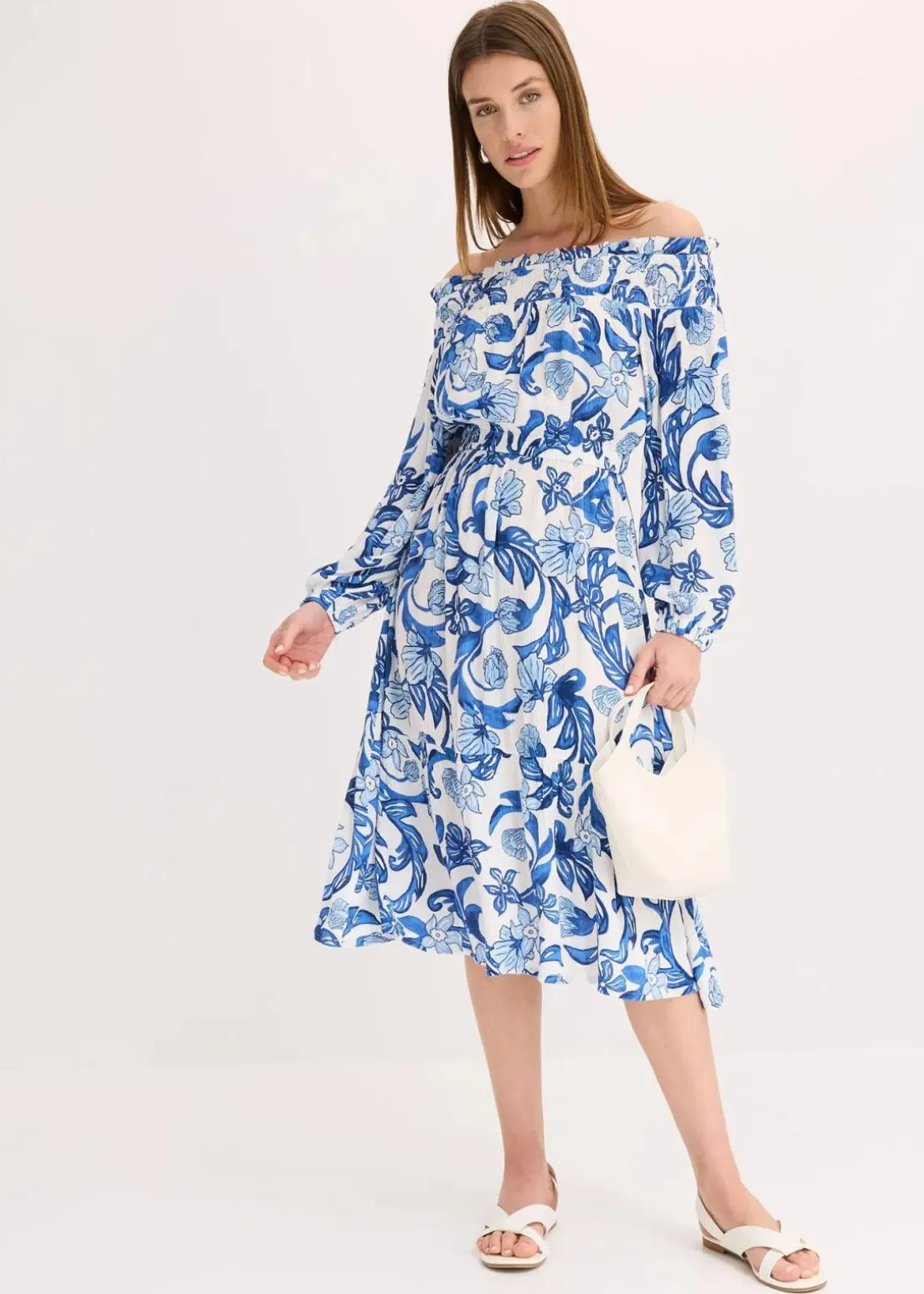 Langes Kleid mit elastischem Carmen-Ausschnitt und Gummizug in der Taille